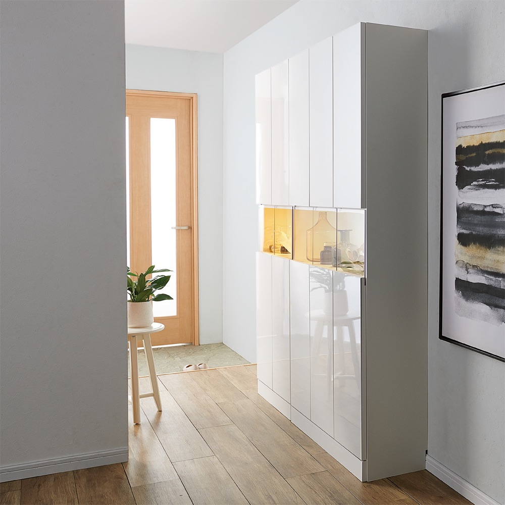 • 【美しく見せるギャラリー収納】扉には割れにくい樹脂素材を採用。縦仕切りがないので長いものも飾れます。