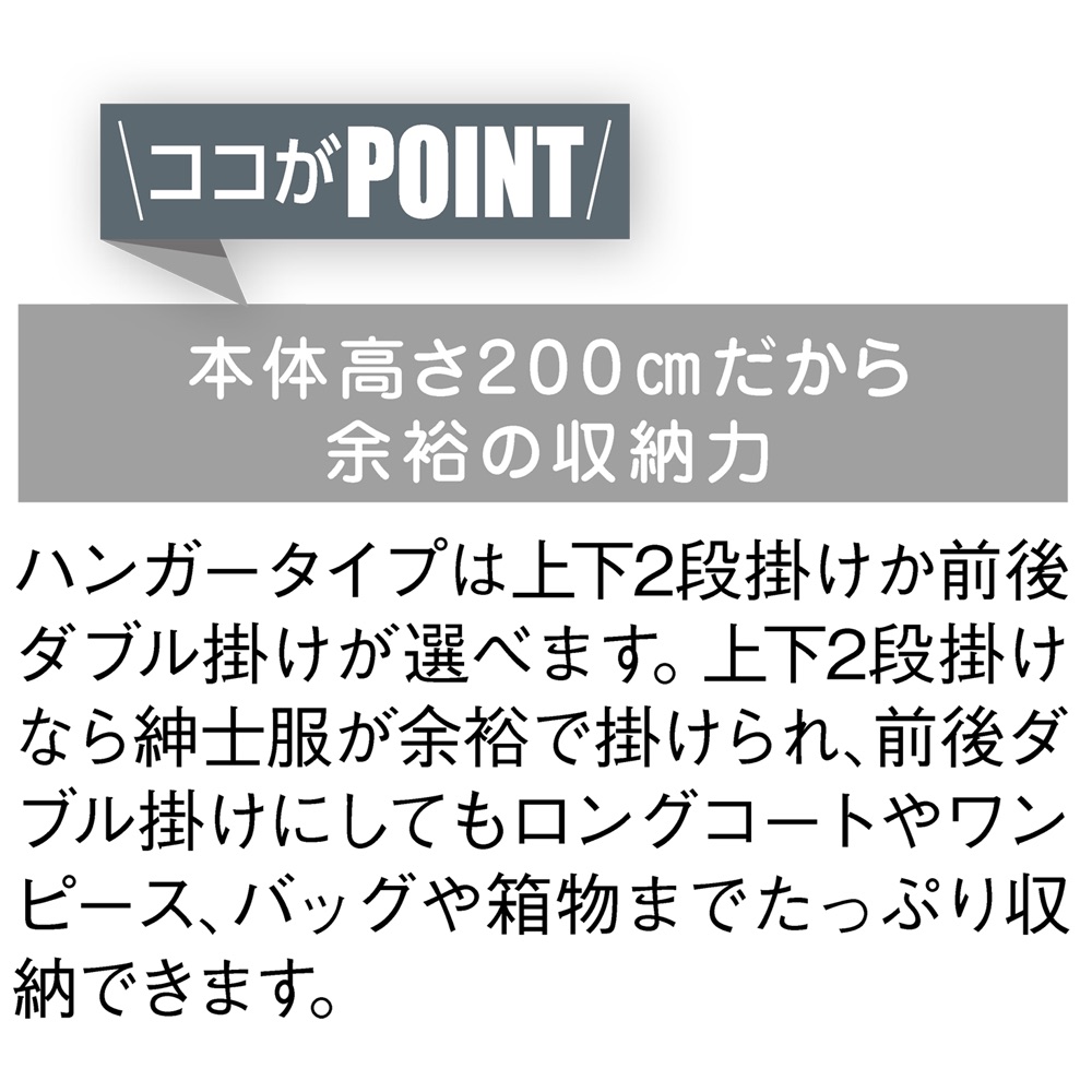 ●備え付けのようなウォークインクローゼットが自宅で手軽に実現できる衣類収納シリーズです。●収納タイプとサイズを豊富にそろえているので設置スペースにぴったり合った、