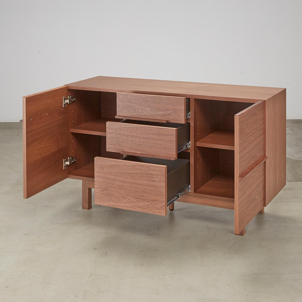 引き出しはスライドレールで開閉はスムーズ。深さ違いの3段の引き出しを装備。扉部分には稼働棚付き。デザインストーリー
