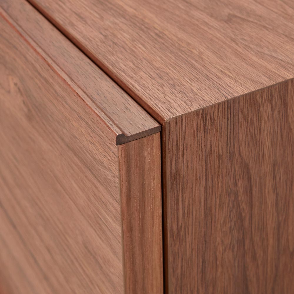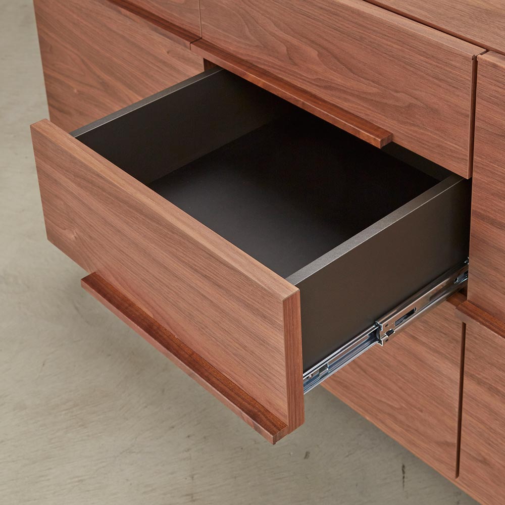 日本の「違い棚」から着想を得てデザインされたシリーズ。前面部は板目が揃うように職人が1つ1つ丁寧に加工しています。これも国産メーカーならではの技術。また角部分は伝統技法・留め加工で丁寧に仕上げられています。留め加工とは