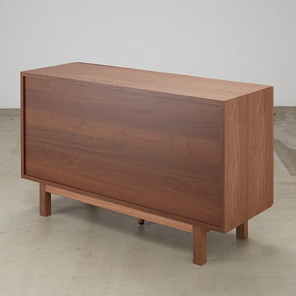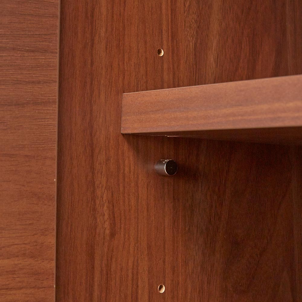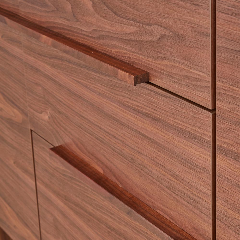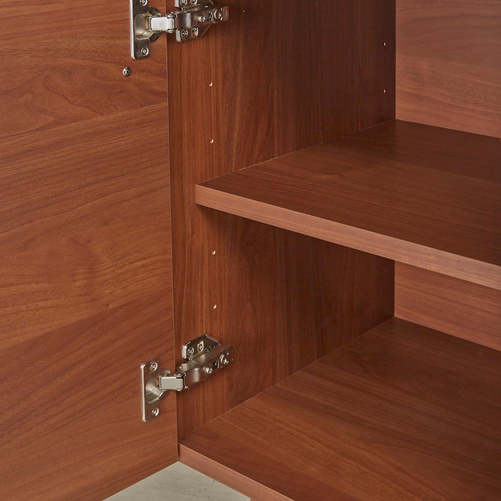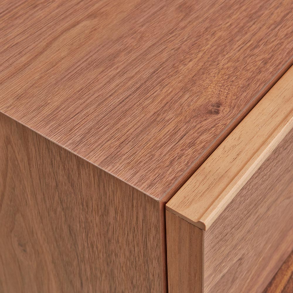 日本の「違い棚」から着想を得てデザインされたシリーズ。前面部は板目が揃うように職人が1つ1つ丁寧に加工しています。これも国産メーカーならではの技術。また角部分は伝統技法・留め加工で丁寧に仕上げられています。留め加工とは