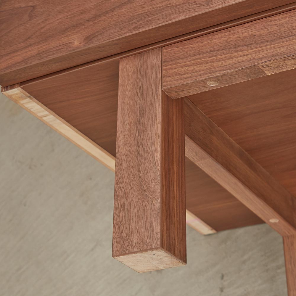 45度に切り落としたパーツ同士を接合する加工のことを言います。留め加工にすることで接合部の溝が目立たなくなり、すっきりとした美しい見た目にすることができます。留め加工がもたらすメリットは大きい一方で、その加工には大変な技術を要します。アリニートシリーズは家具職人が1本1本丁寧に手仕事で仕上げています。別売りのデスクとセットで使うのもおすすめ