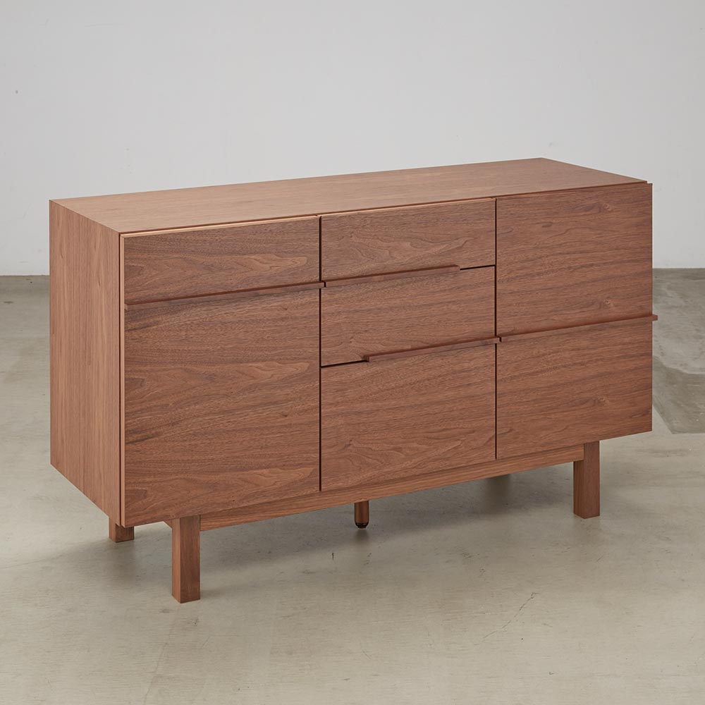 引き出しはスライドレールで開閉はスムーズ。深さ違いの3段の引き出しを装備。扉部分には稼働棚付き。デザインストーリー