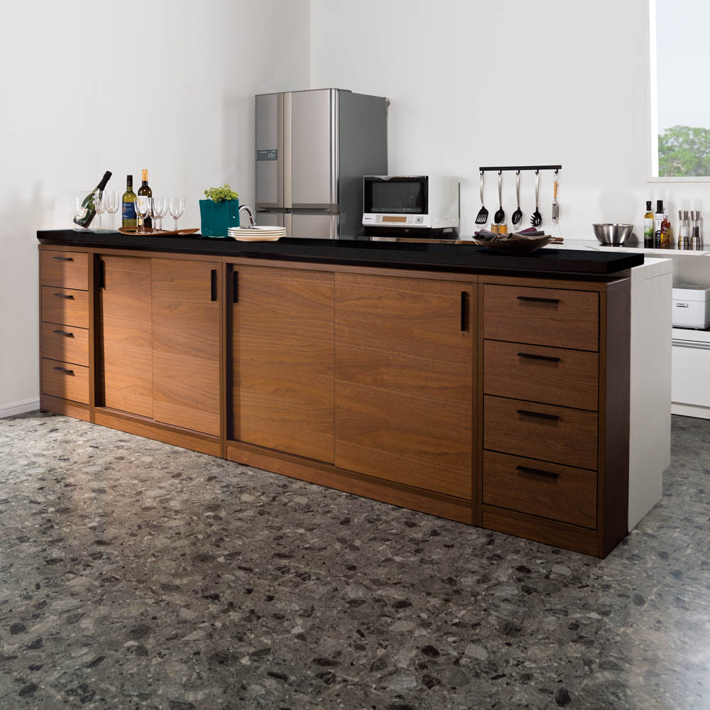 ◆景観をそこねる食器やグラス、食品などを隠して収納できます。インテリアの一部としてこだわり開発・デザインしました。