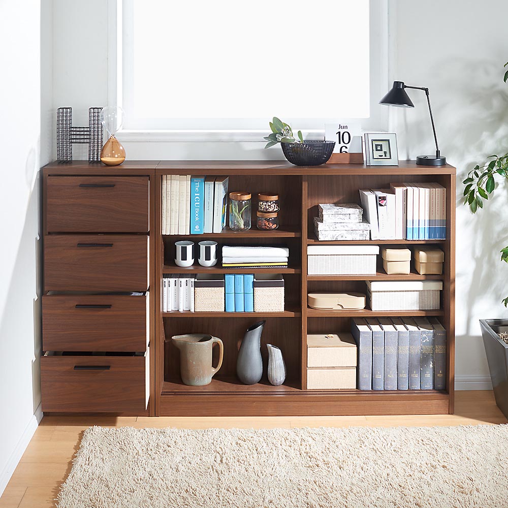 奥行浅めの薄型収納は、設置場所を選ばずリビング収納・書棚としても。