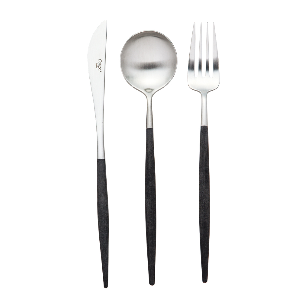 ポルトガル発のカトラリーブランド「クチポール」の代表作「GOA(ゴア)」シリーズ。マットな質感のステンレスと樹脂(レジン)を組み合わせた、モダンでスタイリッシュなデザインが特徴です。このディナー3点セットには、日常の食事に欠かせないナイフ、フォーク、スプーンの3点セットです人間工学に基づいた使い心地の良さ