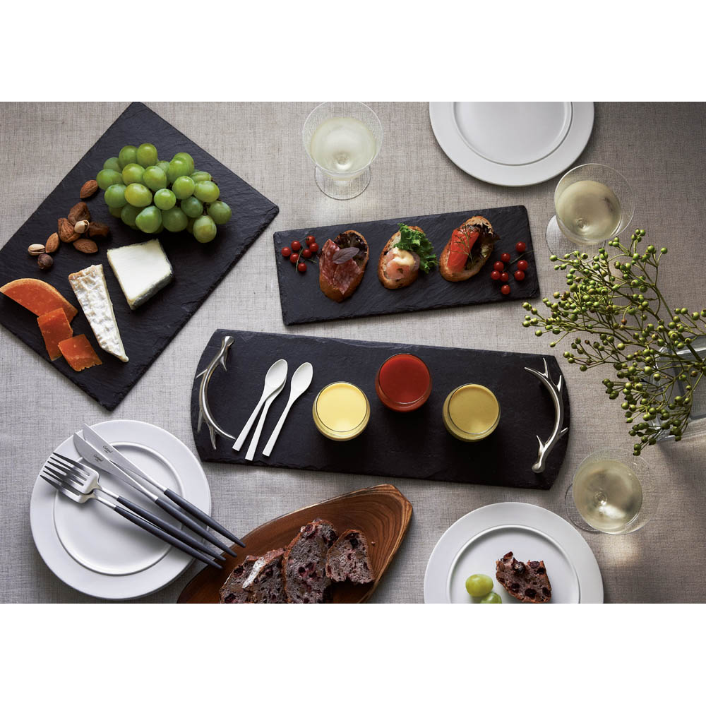 ステンレスとマットな質感の樹脂の組み合わせが生み出す独特の美しさは、食卓のアクセントになります。シックなブラックカラーは和洋どちらのテーブルコーディネートにも調和し、普段使いからおもてなしの場まで幅広く活躍します。ポルトガルの職人による丁寧な手作り