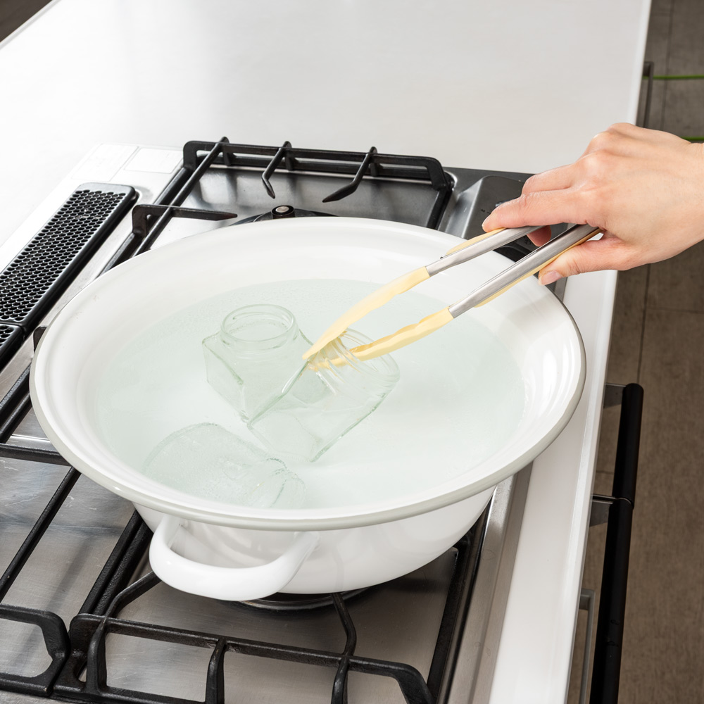 調理に使うクロス類、夏場は特に衛生面が気になりますよね。野田琺瑯が製作しているこのたらいは大量のクロス類も一気に洗える大きさで、そのまま直火にかけて煮沸消毒できるのがとても便利です。洗剤を使わずお湯だけでニオイも雑菌もすっきり落とせて安心です。瓶類も煮沸消毒しやすい大きさと深さ。保存食を安心して作れます。