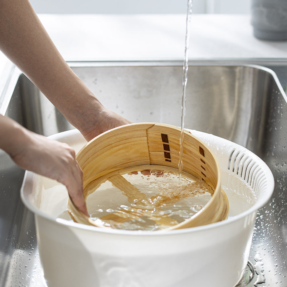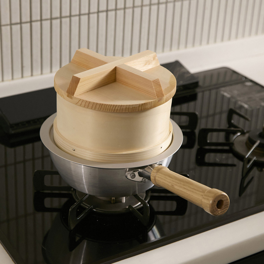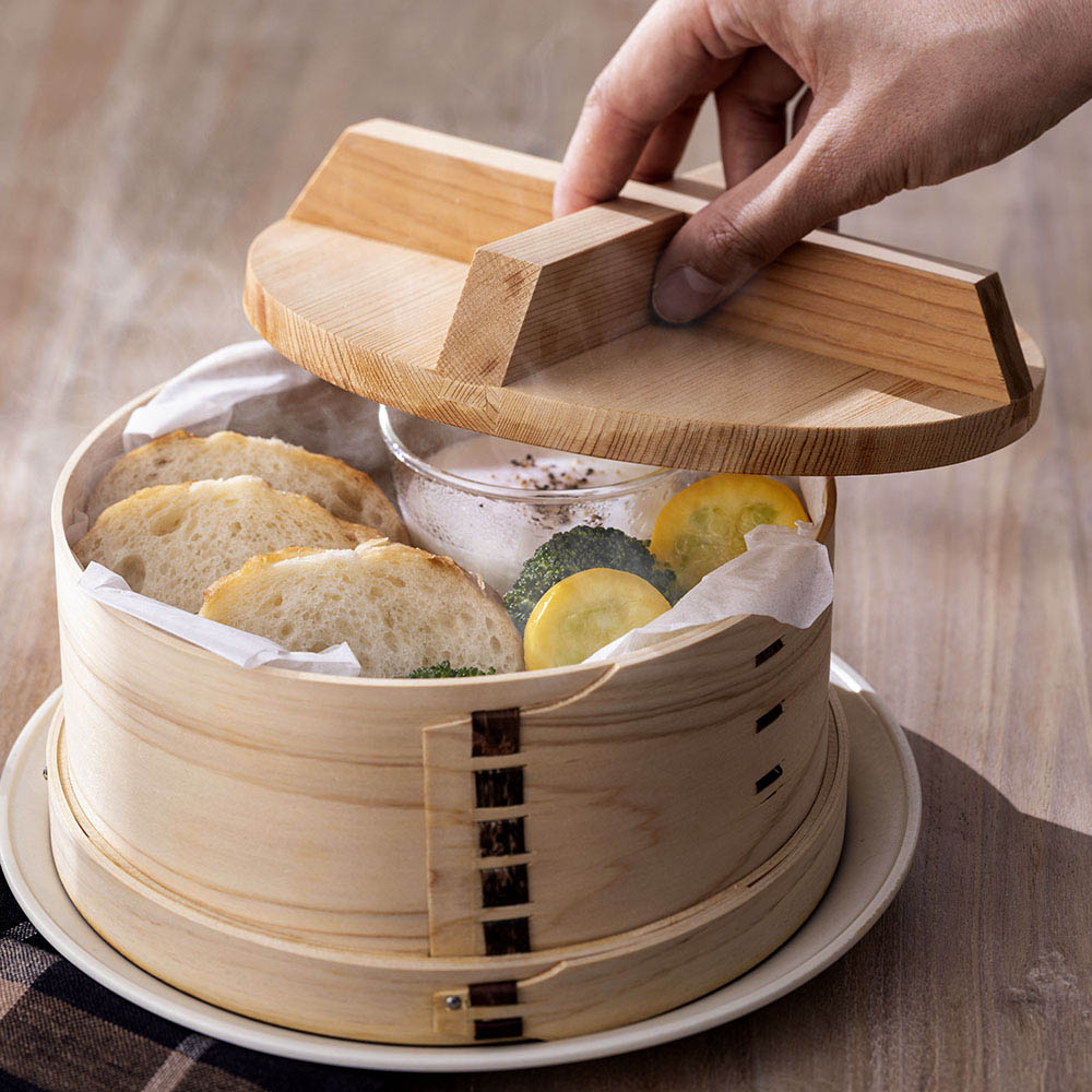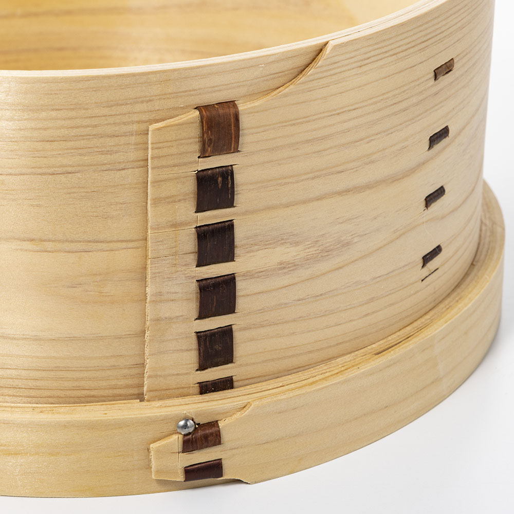 熟練の職人が、一つ一つ丁寧に仕上げた和せいろです。ふたが網代状の中華せいろと違い、和せいろは重い木ふたが蒸気をしっかり閉じ込めるため、時短で調理が可能。湯気と共に立ち昇るヒノキのよい香りにも癒されます。