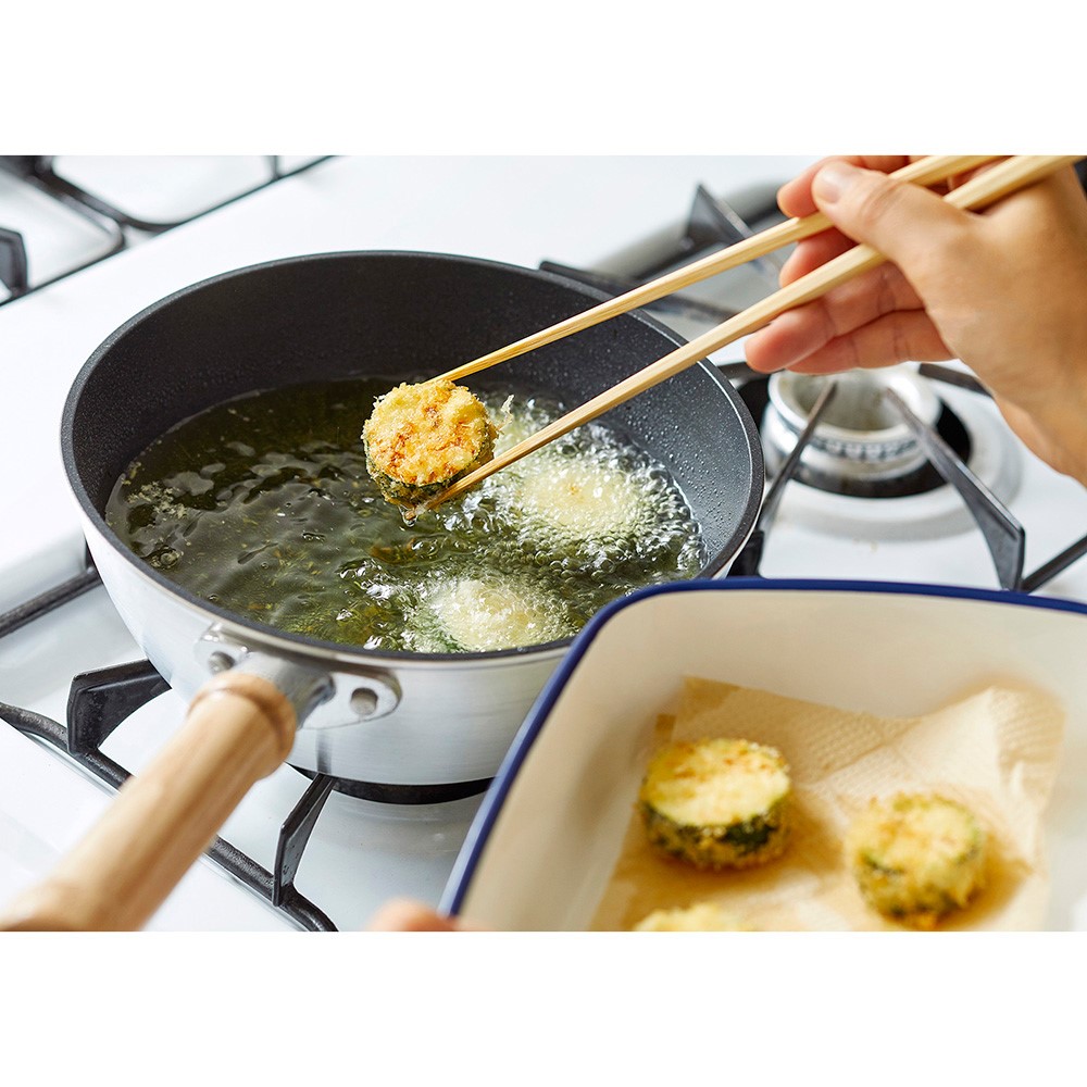 深型の形状を活かして、野菜やパスタなどを茹でる調理はもちろん、たっぷり食材を入れた炒め物料理でも、食材や油が飛び散りにくく、炒飯や野菜炒めなどさまざまに活躍します。炊く