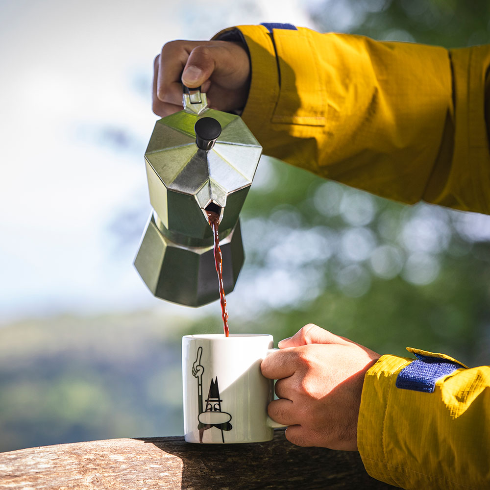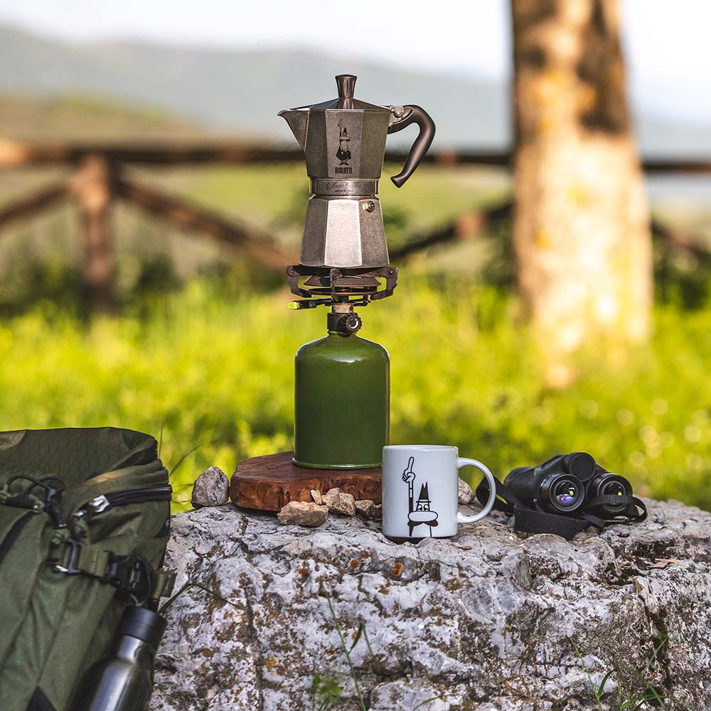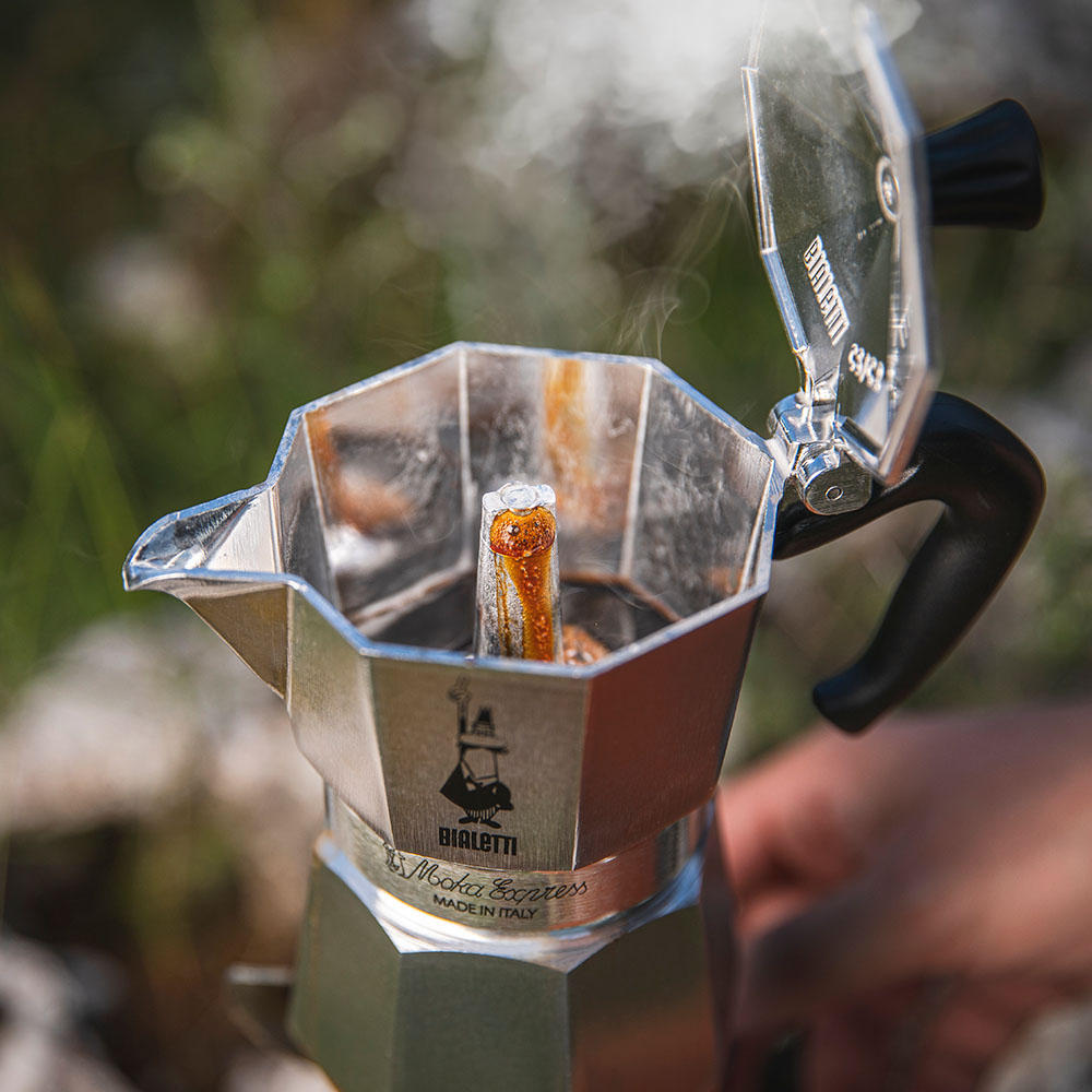 下のボイラーに水を入れ、バスケットに挽いた中細挽きのコーヒー粉を擦切り一杯入れて、直火に掛けるだけ。数分後にはポコポコとエスプレッソがサーバーに上ってきて素早く完成!エスプレッソの名の通り、早く完成しますので忙しい朝にもサッと作れます。キャンプで最高の一杯を楽しめます