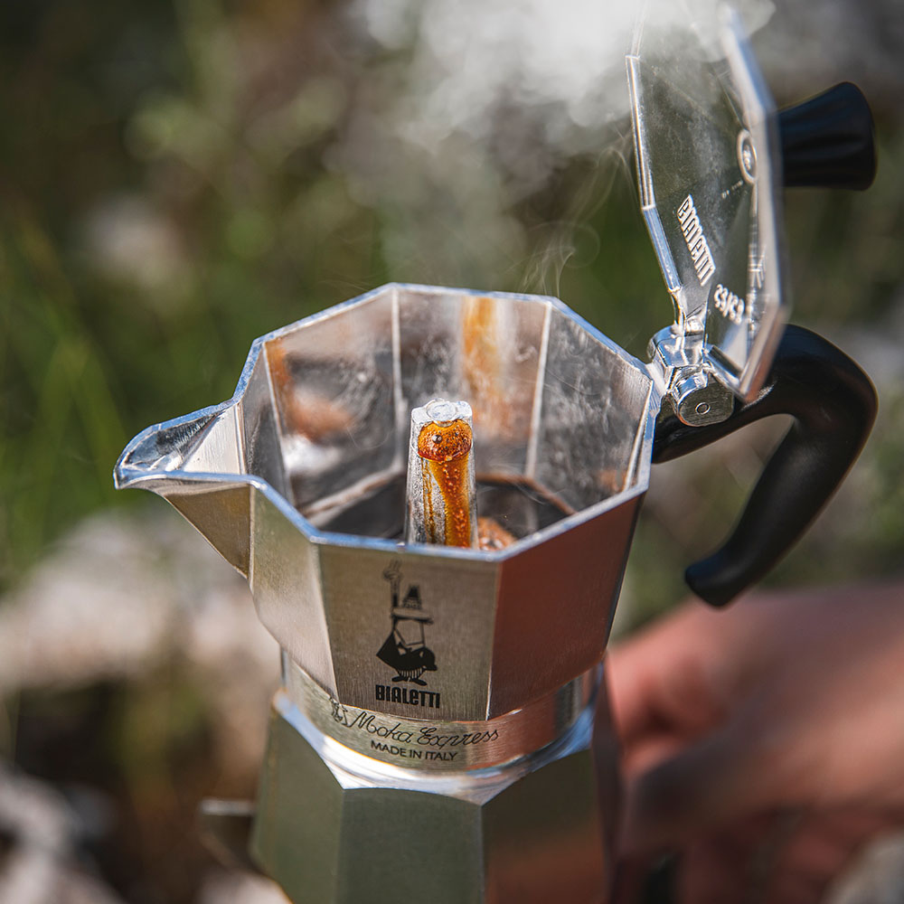 下のボイラーに水を入れ、バスケットに挽いた中細挽きのコーヒー粉を擦切り一杯入れて、直火に掛けるだけ。数分後にはポコポコとエスプレッソがサーバーに上ってきて素早く完成!エスプレッソの名の通り、早く完成しますので忙しい朝にもサッと作れます。キャンプで最高の一杯を楽しめます