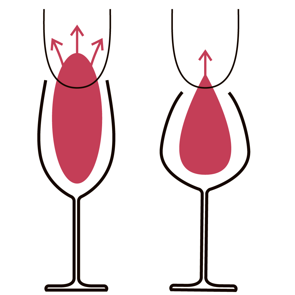 左…大きなボウルで舌上でワインが横に広がるため厚みのあるボディーを感じつつ、強い渋みを和らげる。 右…ワインが舌先に触れてすっと奥まで届くので強い酸味と果実味のバランスを整える。