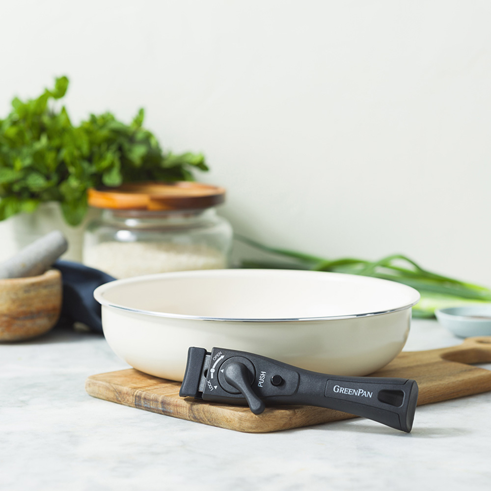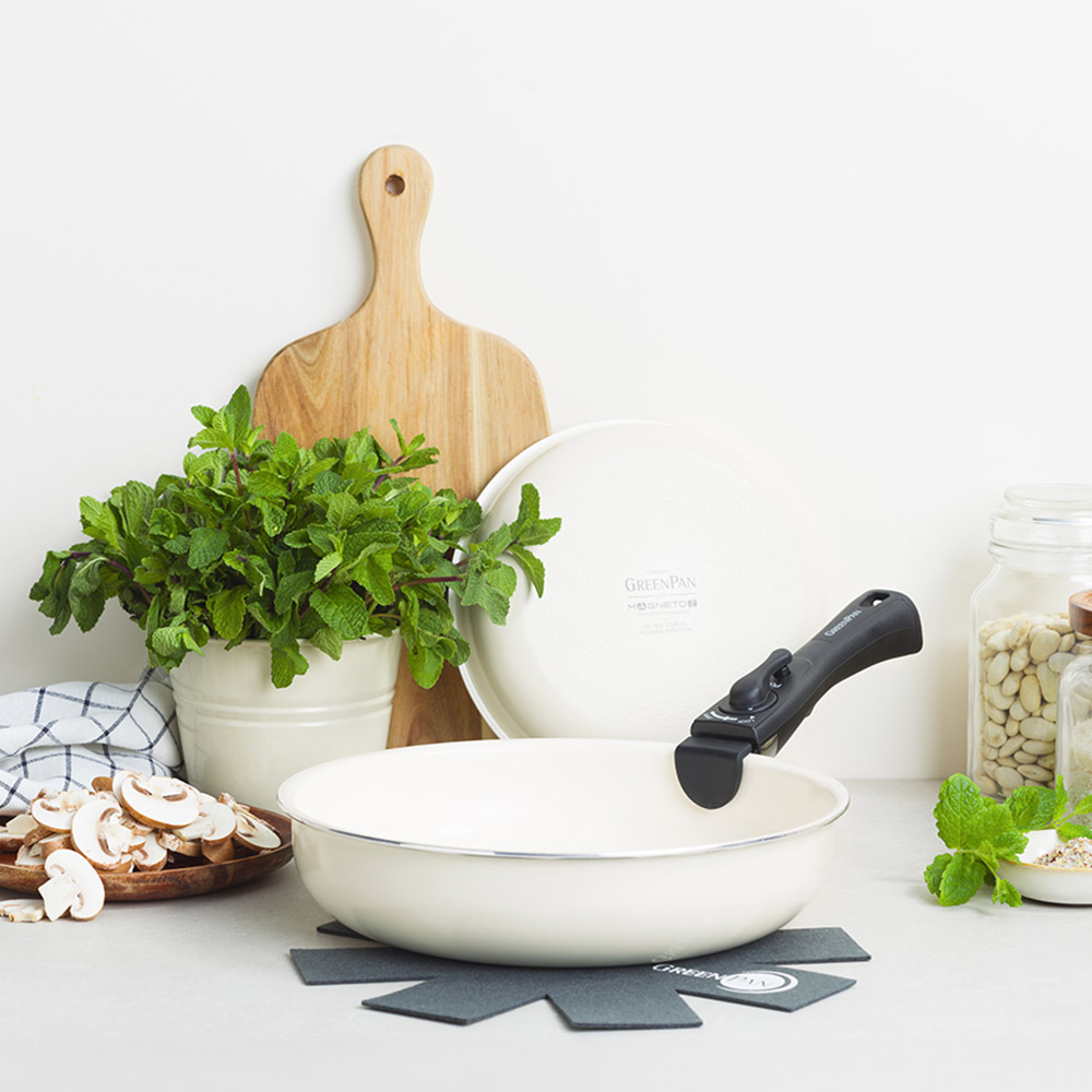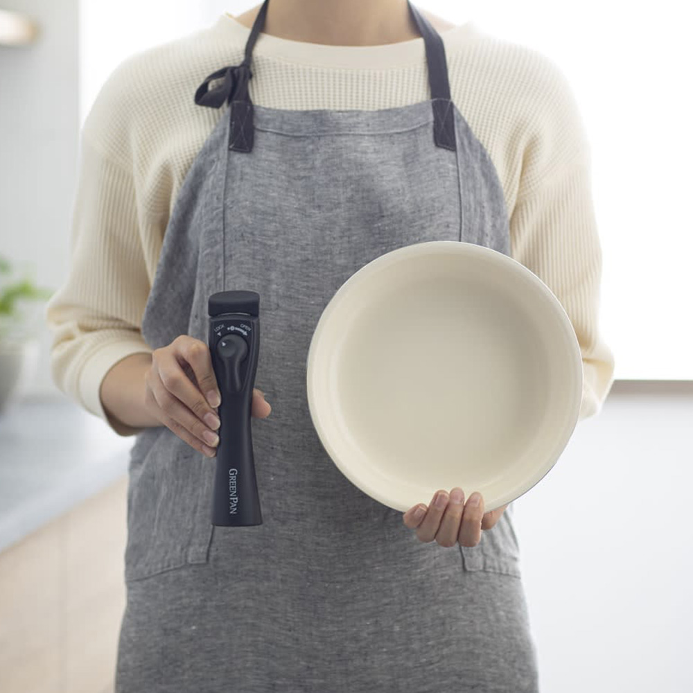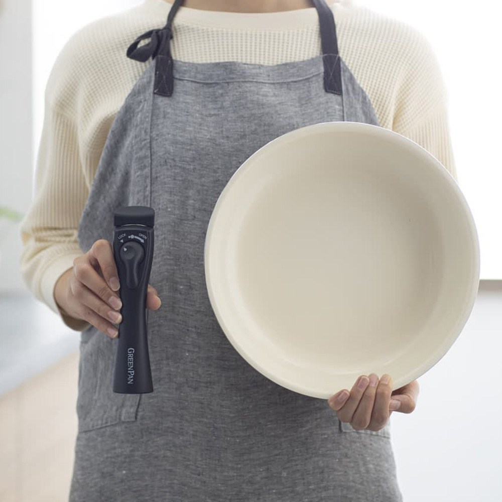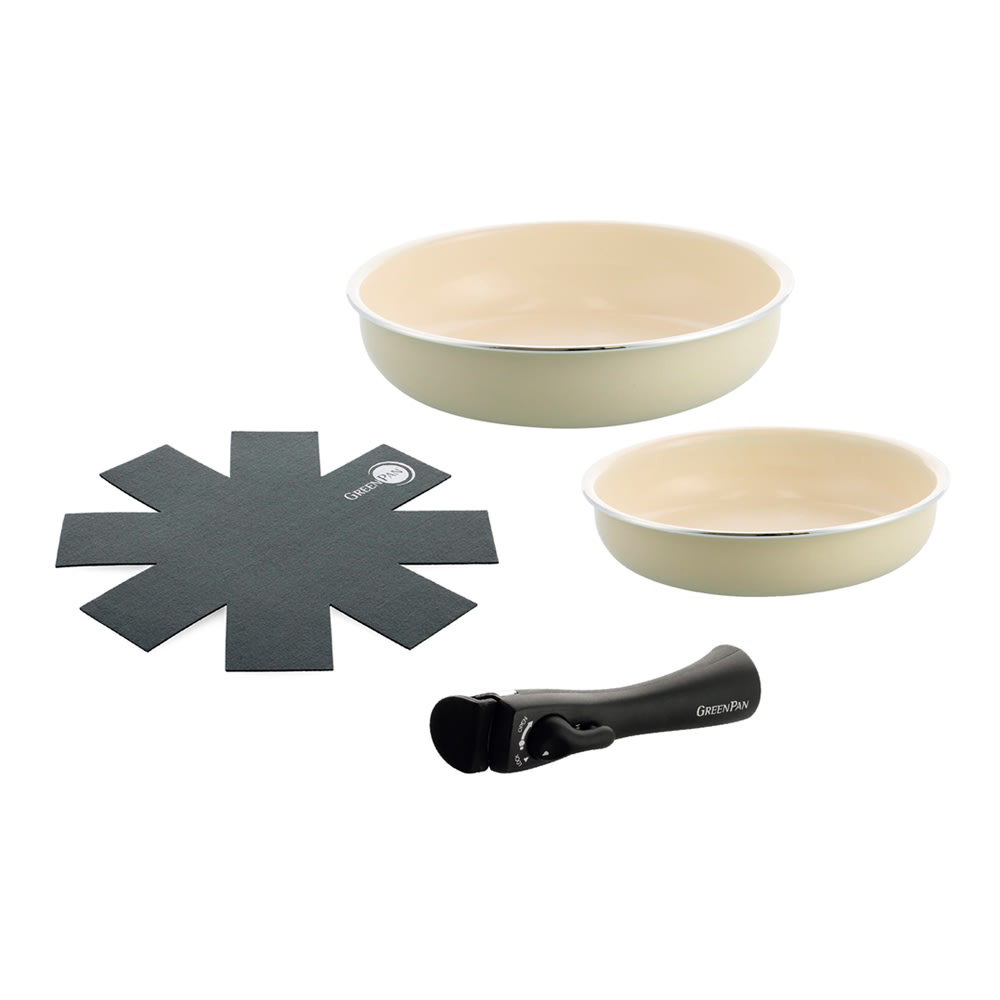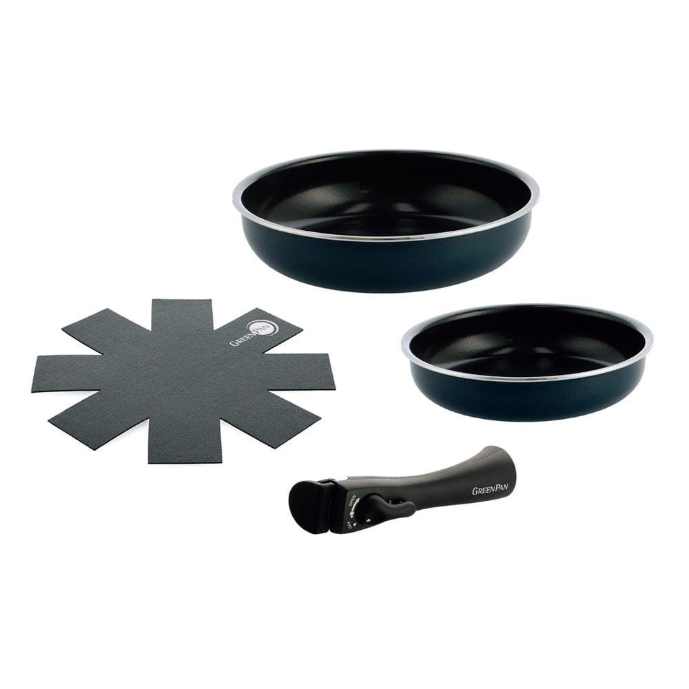 20cm ・26cmのフライパン、ハンドル1本、保護フェルト1枚の4点セット。フッ素樹脂を一切使わないセラミックコーティング調理器具のパイオニア、グリーンパン。主に砂と同じ成分の自然由来の塗装なので安心して使えるうえ、熱伝導率が高く料理がおいしく仕上がります。着脱式ハンドルで食卓にそのまま出せる美しいデザインはグリーンパンならでは。
