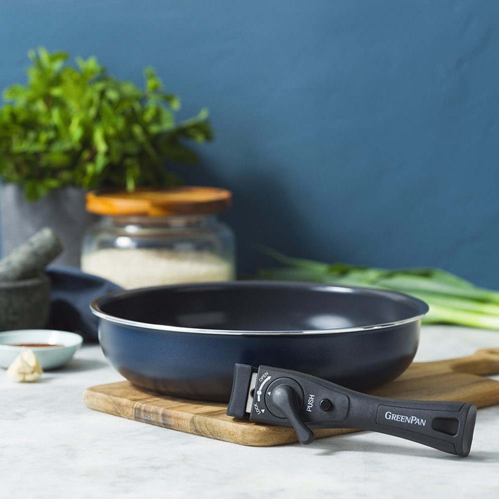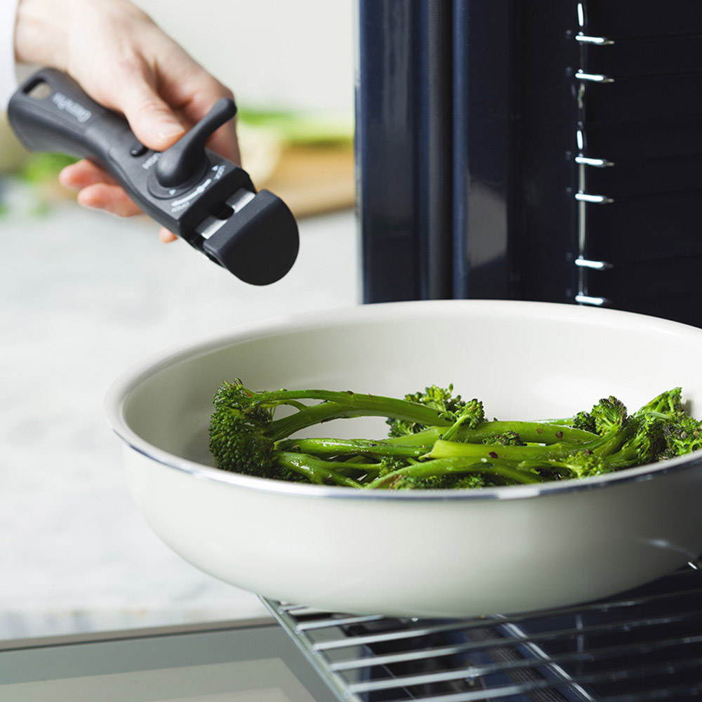 ハンドルが取り外せることで、収納性も調理の幅もグンとアップします。フライパン本体は最大260°Cの高温にも耐えられるのでオーブン調理が可能です。着脱式ハンドルは取り付けも取り外しもスムーズ。取り外す際は2段階のロックシステムにより滑り落ちなどを防止します。