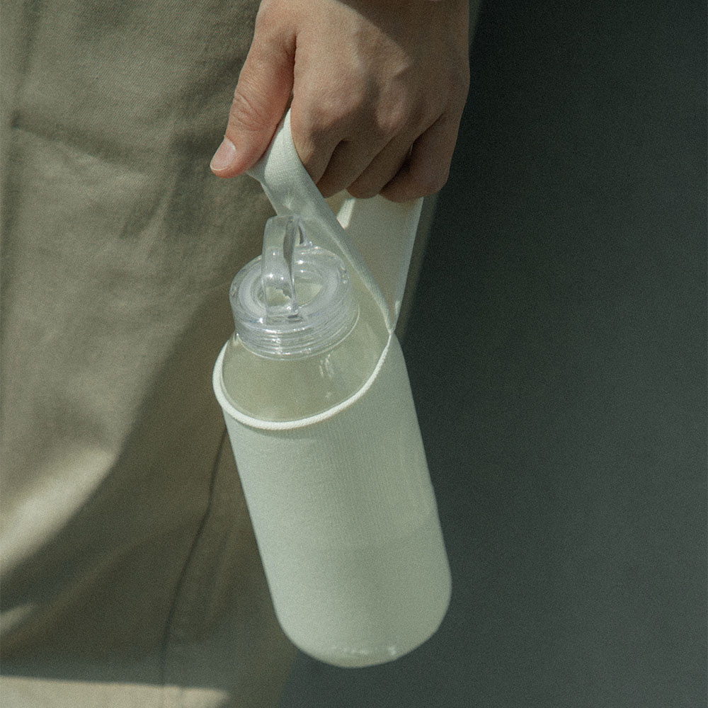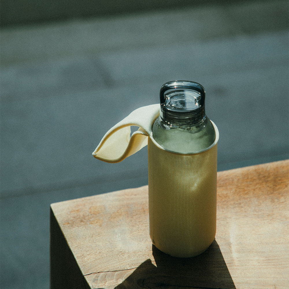 日常を豊かにするアイテムをより幅広く提案したいという想いから生まれたファブリックアイテムFUTOの、ボトルをより気軽に持ち運べるリストバッグです。KINTOウォータータンブラーにぴったりフィット。ハンドルに手を通して持ち運び、スムーズに飲むことができます。「持つ」と「飲む」が自然につながるデザインです。冷たい飲み物を入れたときの結露を吸収します。スマートフォンや小物を入れるのにもちょうど良いサイズ。乾きやすく、丈夫で扱いやすい素材で、洗濯もできるので日常使いに適しています。バッグ部分には、ボトルをしっかりとホールドする伸縮性のあるナイロンのニット素材を採用。ハンドル部分は伸びすぎを防ぐため、裏面にポリエステルの糸を編み込んでいます。