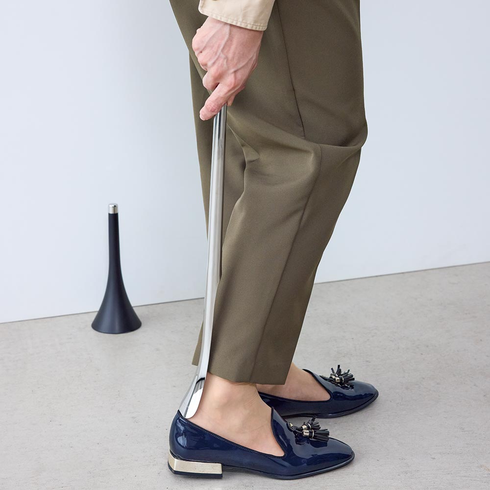 立ったままスムーズに抜き差しができるロングタイプの靴ベラ。玄関がスッキリ見える洗練のデザインです。