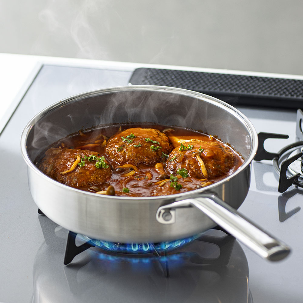 プロの料理人の多くが選ぶ丈夫で、蓄熱性の高いステンレス素材が魅力。いつもの料理もワンランク上の仕上がりに。 ※画像はフライパン20cmです。