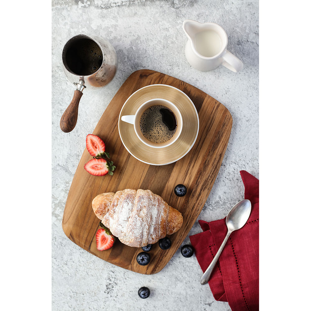 丸みを帯びた優雅なデザインが特徴的なチーク材のカッティングボードです。個性的なチーク材の美しい木目を活かした魅力的な一品で、エレガントな雰囲気でリラックスした空間を演出します。食材をカットするだけでなく、そのままテーブルに出してサービングボードとしてもぴったりです。チーク材の優れた特性