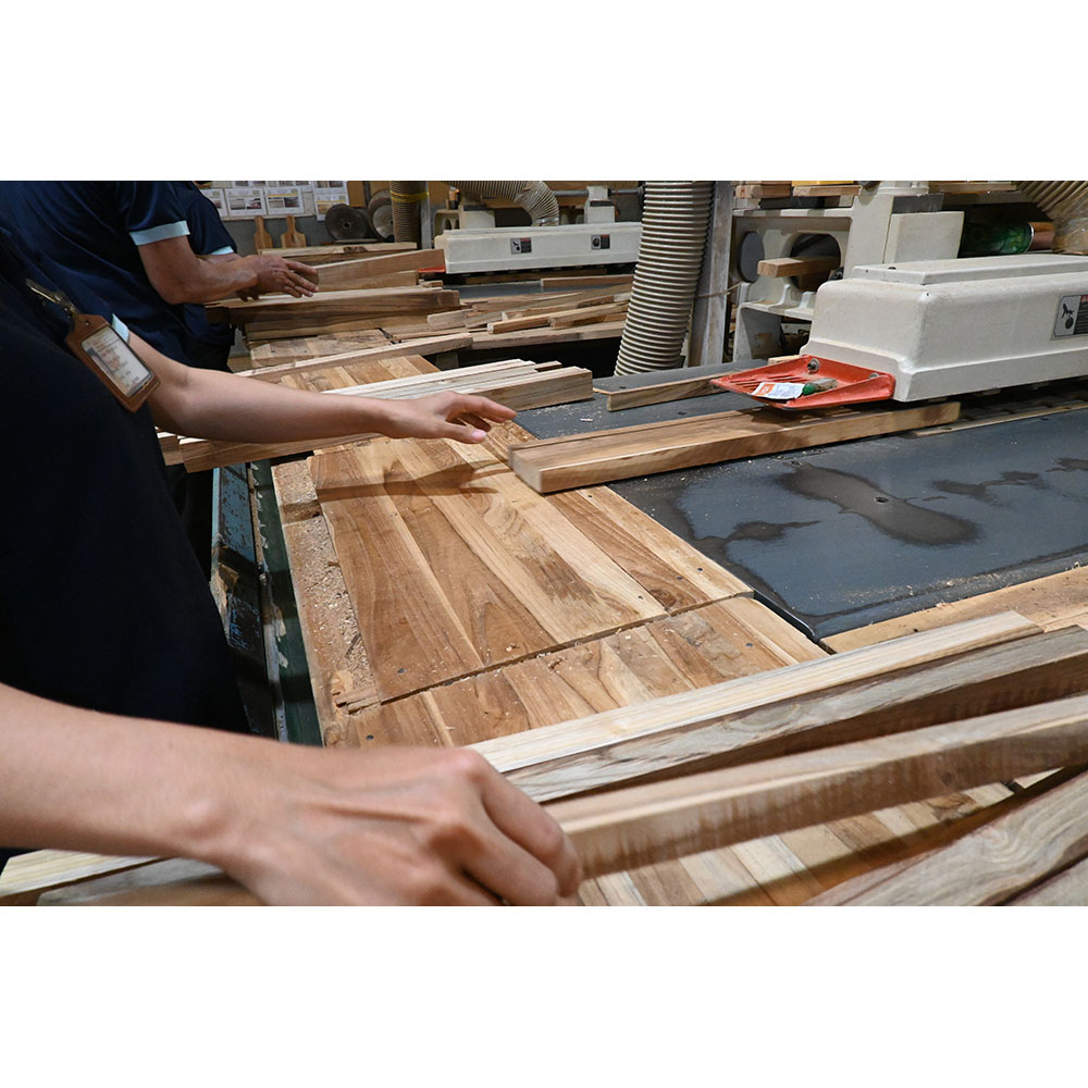 チーク材は屋外の家具でも使用されるほど頑丈な素材。硬さと張りがあり、良質の天然油分を含むことから優れた耐久性を誇ります。サイズ展開