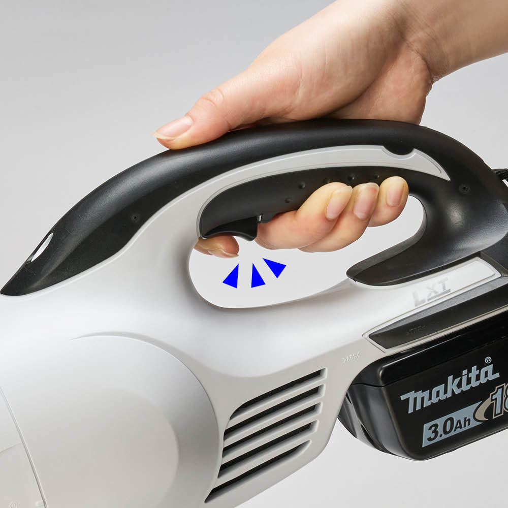 握るとスイッチが入り、手を放すとオフになるトリガー式スイッチを採用。ムダなく使用したい時だけ電源を入れることができるので、バッテリー消費を抑えて広い範囲の掃除が可能になり、節電にもつながります。