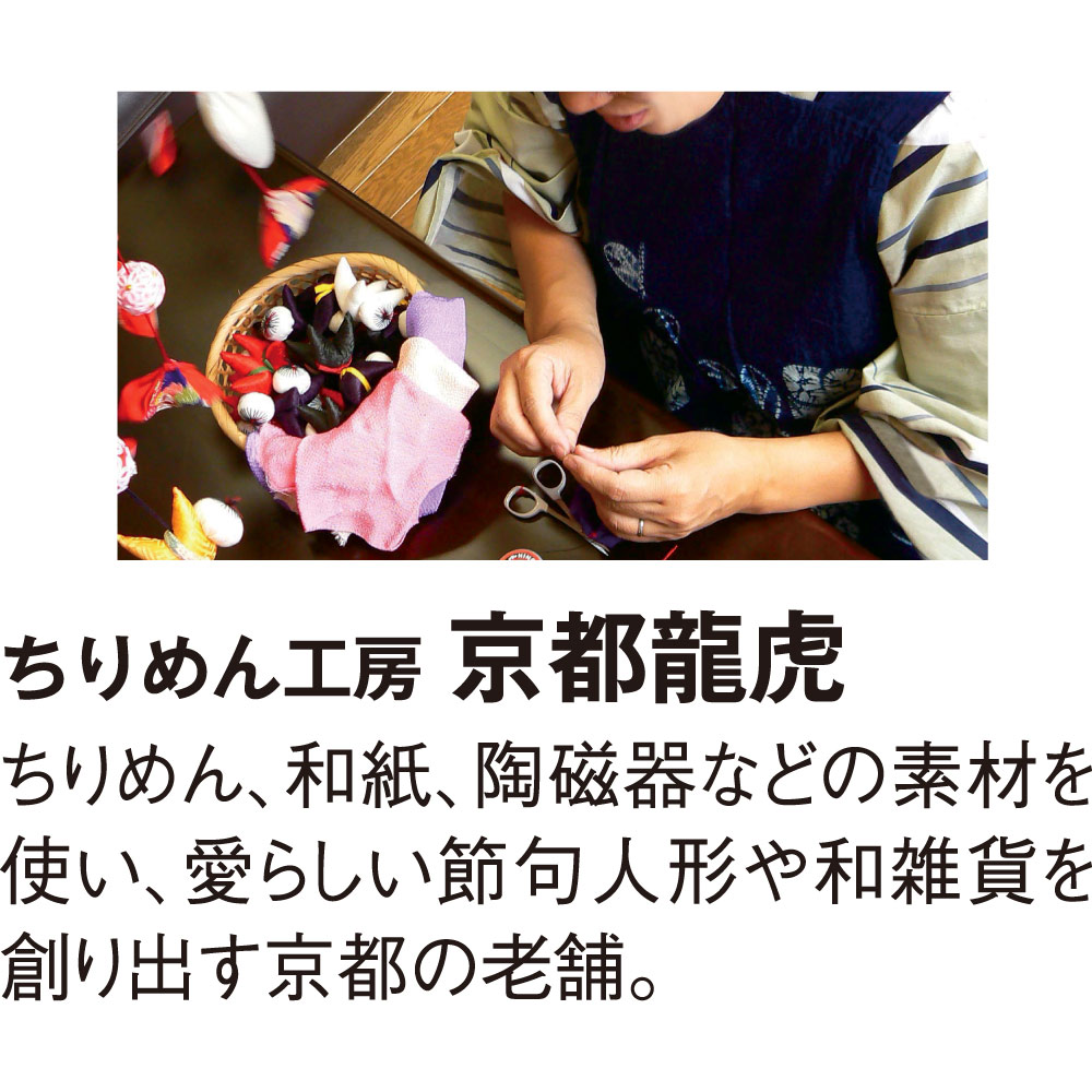 ちりめん、和紙、陶磁器などの素材を使い、愛らしい節句人形や和雑貨を創り出す京都の老舗。
