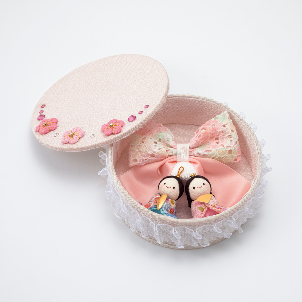 大きなパステル調のリボンがアクセントになっていて、コンパクトなサイズ感ながらもしっかりとした存在感があるお雛様です。