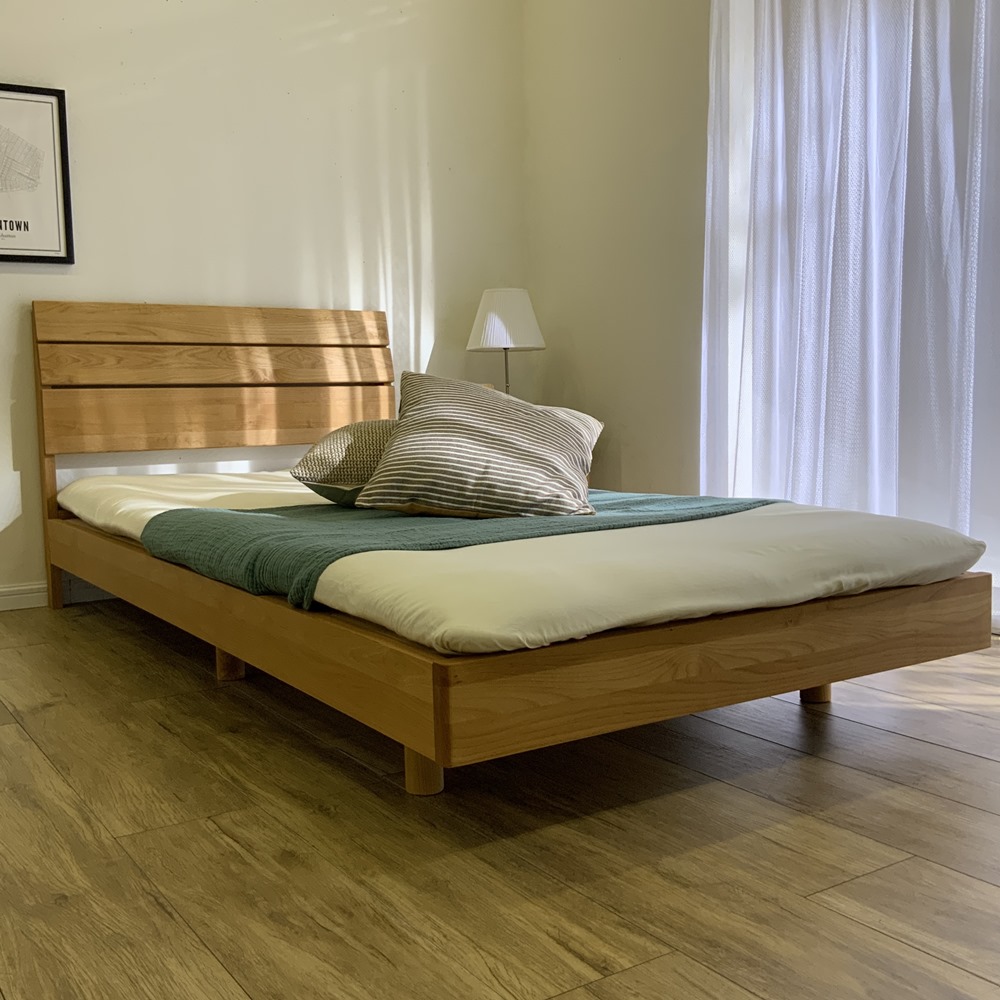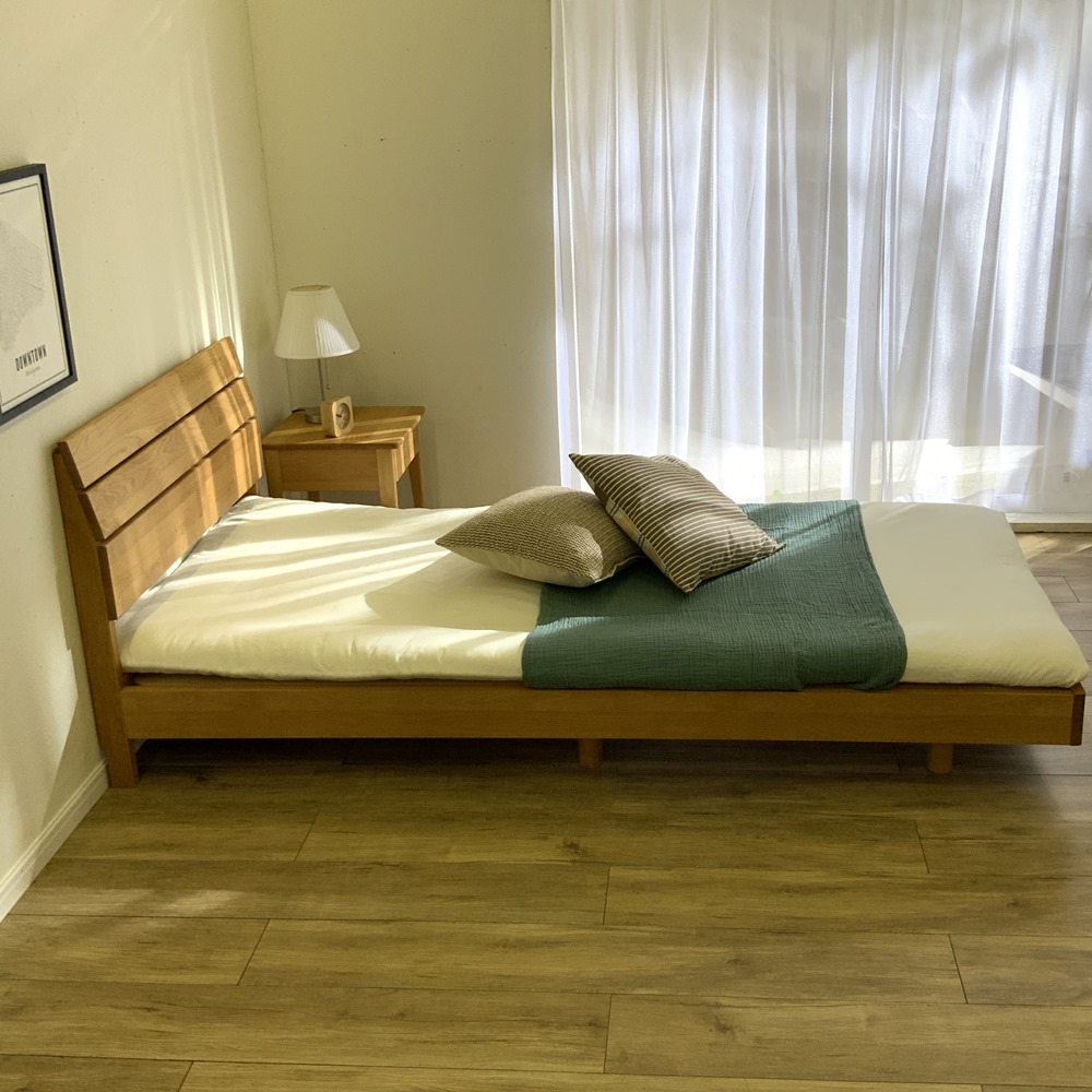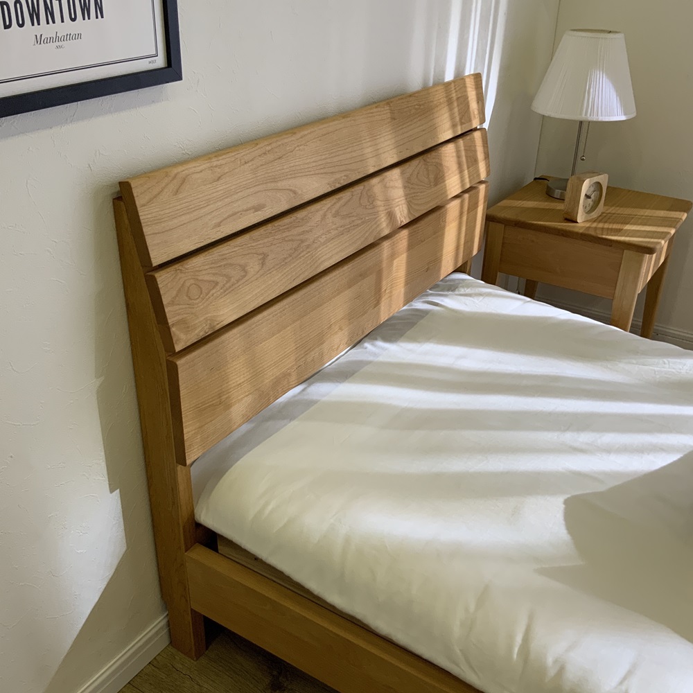 ・幅広のアルダー無垢材を使用したヘッドボードのデザインは飽きることなく長くご愛用いただけます。・足元のフットボードの角は丸く仕上げました。見た目の美しさだけでなく 安全性も考慮したデザインでお子様やお年寄りでも安心してお使いいただけます。