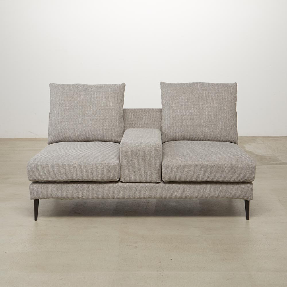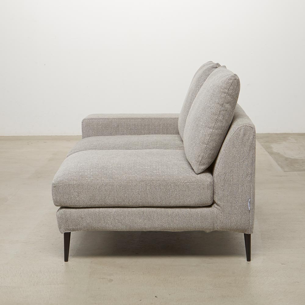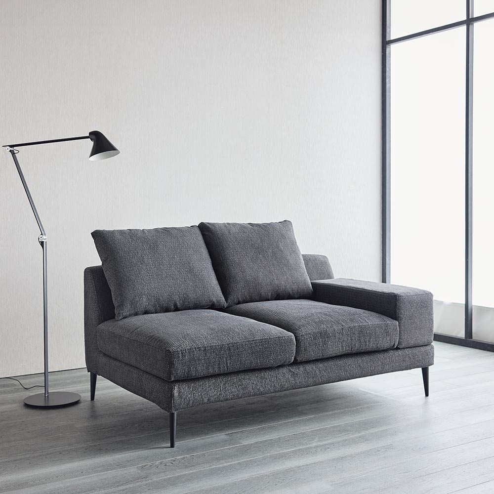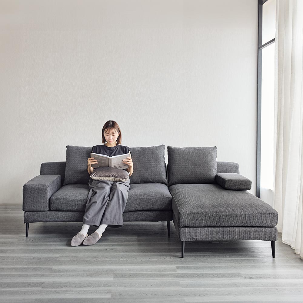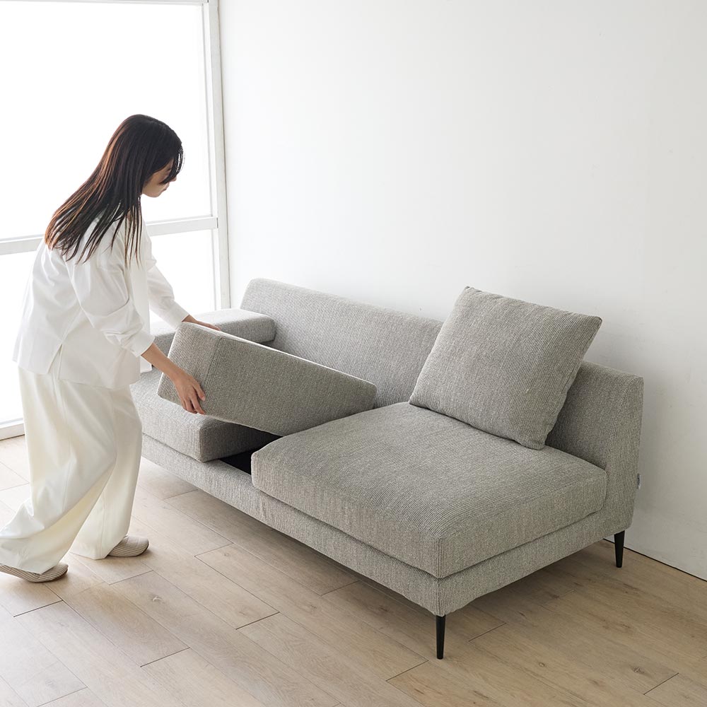 シリーズのソファ3P・ソファ2Pには着脱式アーム、シェーズロングにはアームクッションが付属しており、アームの配置によって、使い勝手やソファアイテムのレイアウトに様々なバリエーションが生まれます。シンプルなアイテム構成でありながら、過ごし方の自由度が高いソファシリーズです。張地は2色展開で撥水効果があり、手洗いできるカバーリング仕様です。