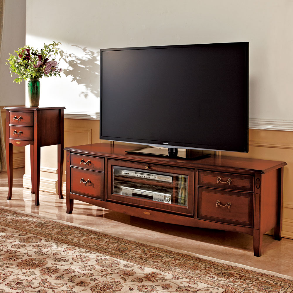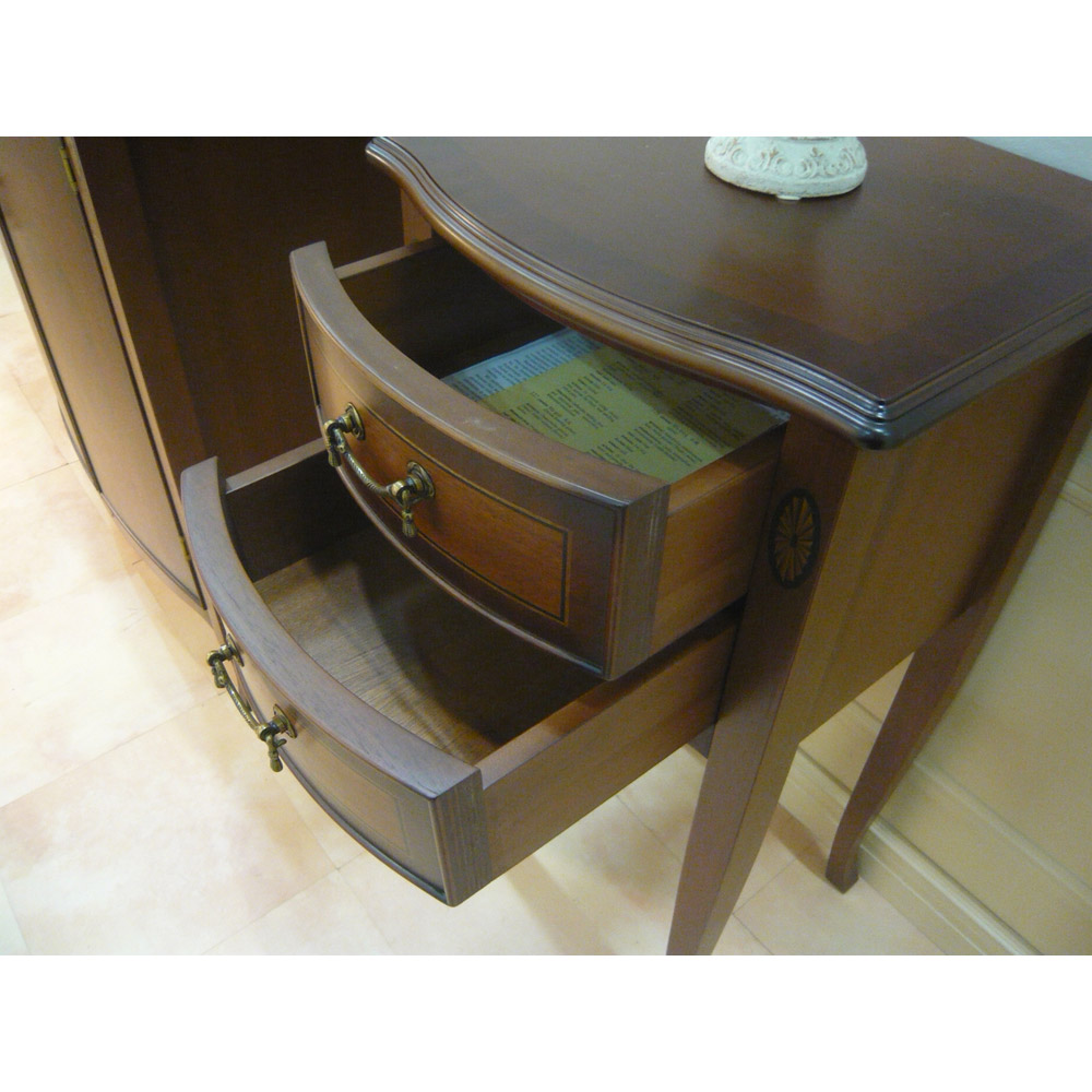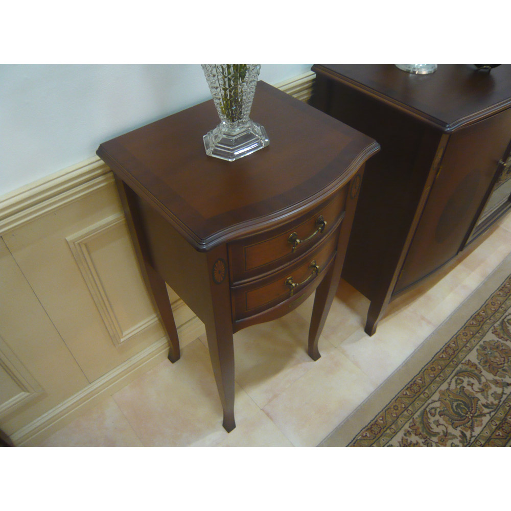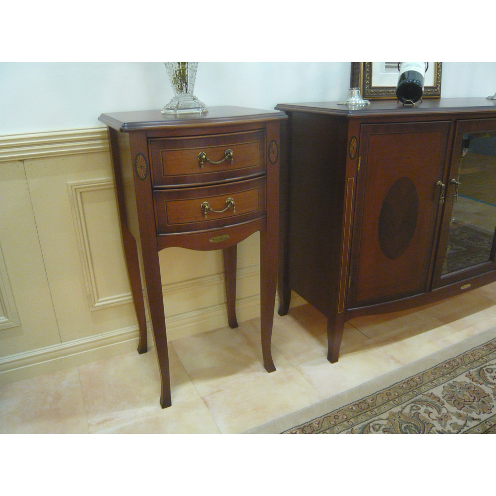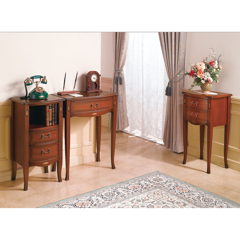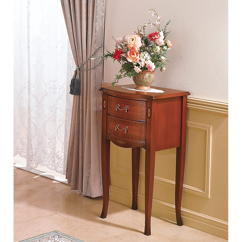繊細な木肌のマホガニー材を17世紀中期の「ネオクラシックスタイル」を基本とした、コンパクトタイプのアクセント家具の提案です。卓越した職人の「技」による象がん細工の繊細さと、緩やかな曲線のフロントラインを活かしたデザインに、落ち着いたアンティーク仕上げの装いは、伝統的なヨーロッパの格式と優美さを醸し出し、クラシカルな魅力に溢れたインテリアを充実させます。