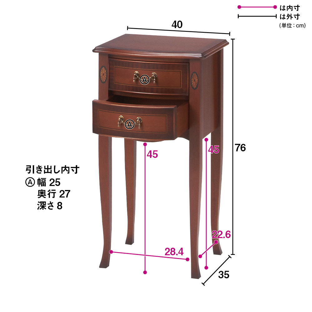 ■サイズ:幅40cm奥行35cm高さ76cm、脚部高さ45cm、脚部内寸幅28.6cm、引き出し奥行27cm・重量約10kg
