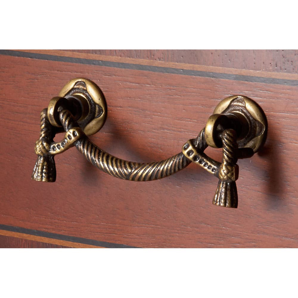扉と引出しの引手には、ヨーロッパ調のタッセル模様(カーテンの飾りふさ)のデザインのものを採用し、クラシカルな装いを強調しました。【世界3大銘木とうたわれる高級材「マホガニー天然木」を使用した上質家具】