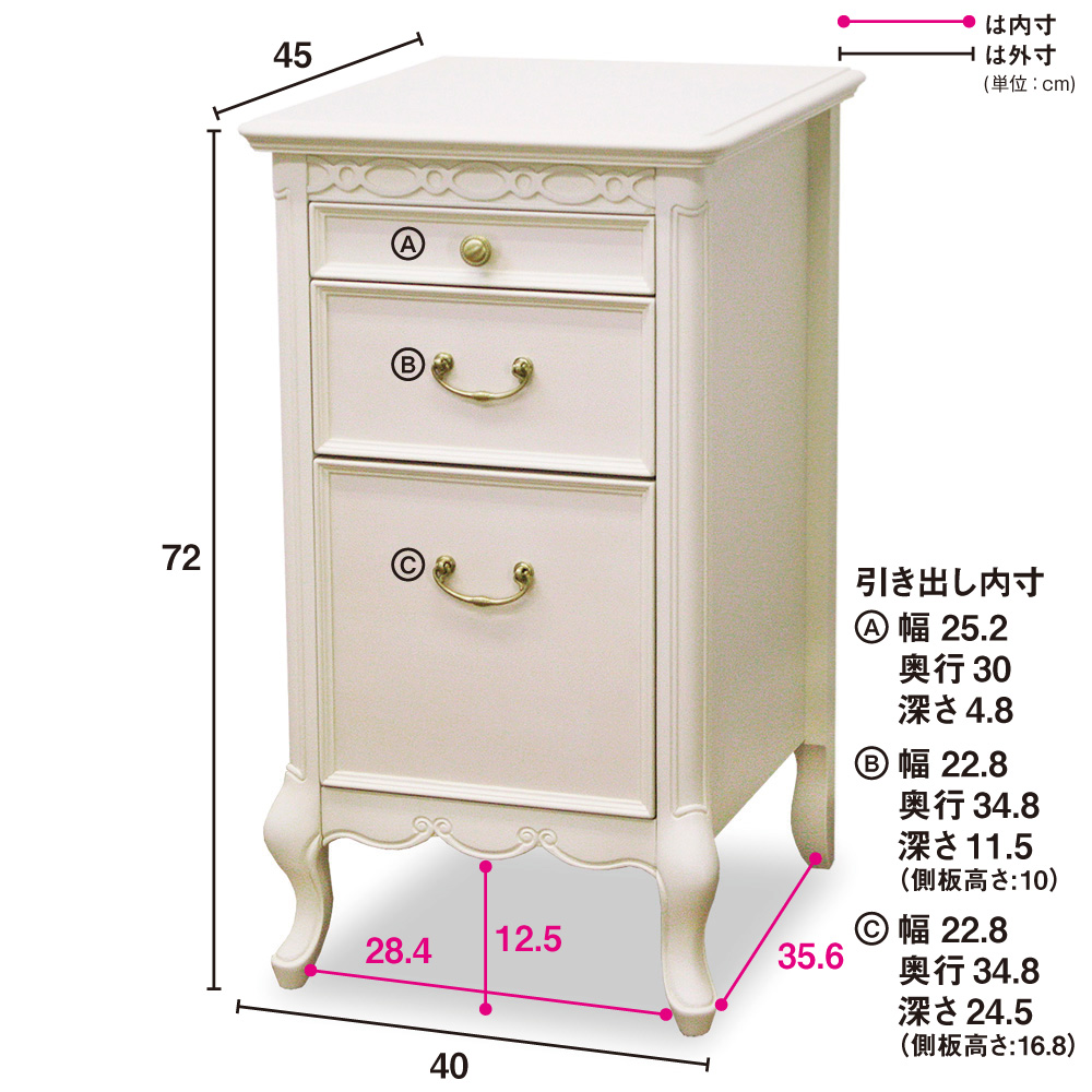 ■サイズ:幅40奥行45高さ72cm、引き出し奥行…1段目30、2・3段目34.8cm