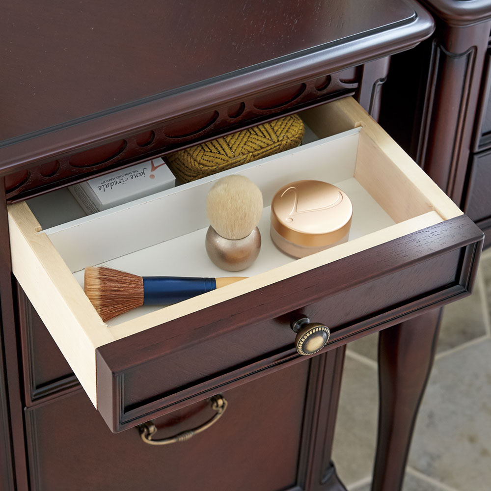 ■最上段の引き出しは細かいコスメ類が収納できるサイズ設計。■最上段の引き出し内部は汚れてもお手入れがしやすいメラミン塗装仕様。