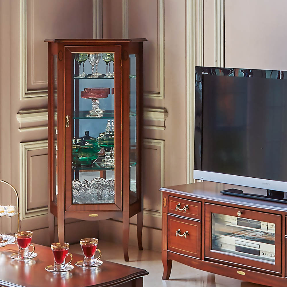 繊細な木肌のマホガニー材を17世紀中期の「ネオクラシックスタイル」を基本とした、コンパクトタイプのアクセント家具の提案です。卓越した職人の「技」による象がん細工の繊細さと、緩やかな曲線のフロントラインを活かしたデザインに、落ち着いたアンティーク仕上げの装いは、伝統的なヨーロッパの格式と優美さを醸し出し、クラシカルな魅力に溢れたインテリアを充実させます。