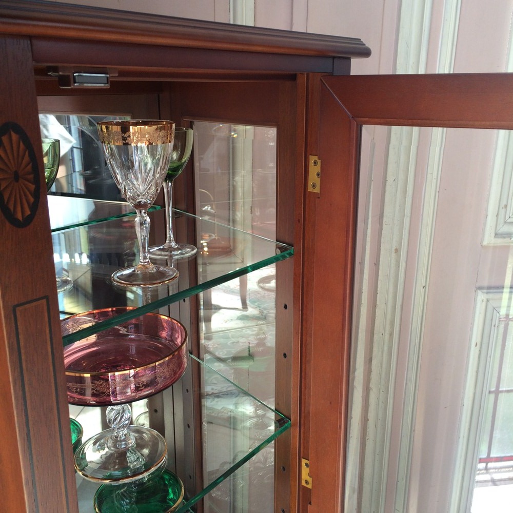 ガラス棚板が美しい仕上がり。アンティーク用品などを飾るのにも活躍します。