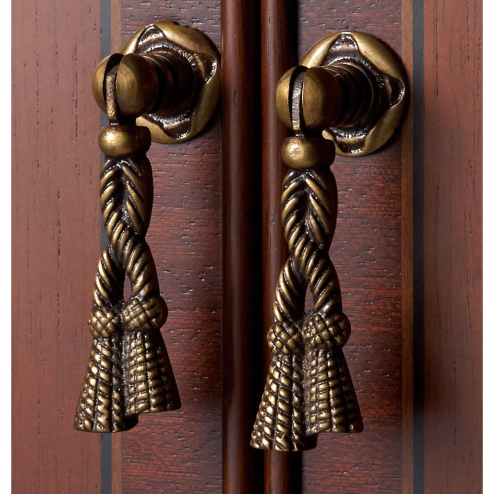扉と引出しの引手には、ヨーロッパ調のタッセル模様(カーテンの飾りふさ)のデザインのものを採用し、クラシカルな装いを強調しました。【世界3大銘木とうたわれる高級材「マホガニー天然木」を使用した上質家具】