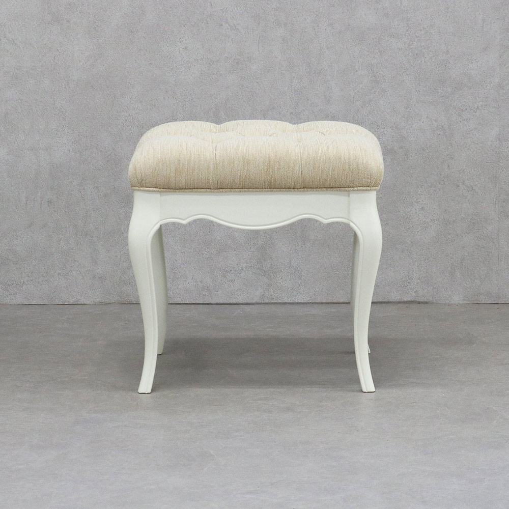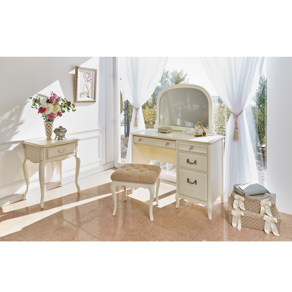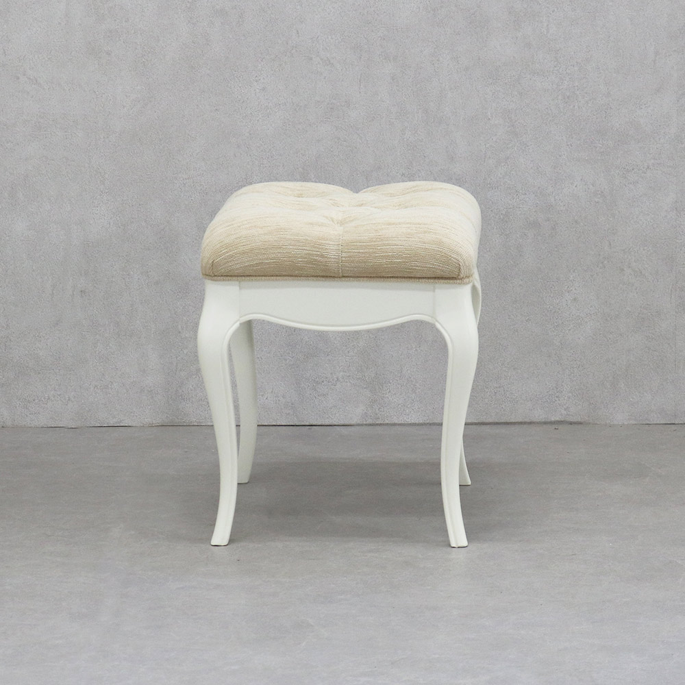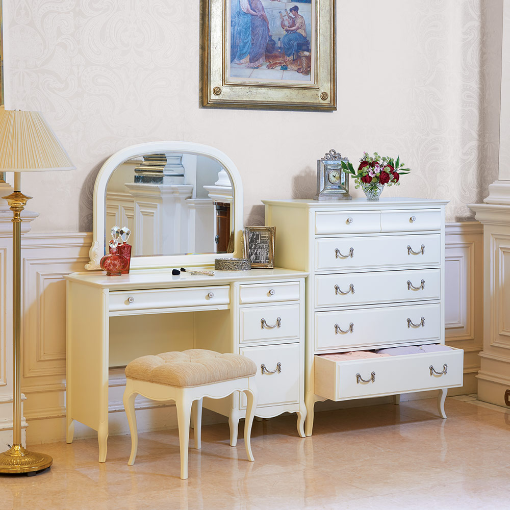 • コーディネート例(ア)ホワイト 19世紀頃の優美なフレンチスタイルを再現しながら、使いやすさにもこだわりました。 ※お届けはスツールです。写真は別売りのドレッサーデスク・チェスト5段との組合せです。