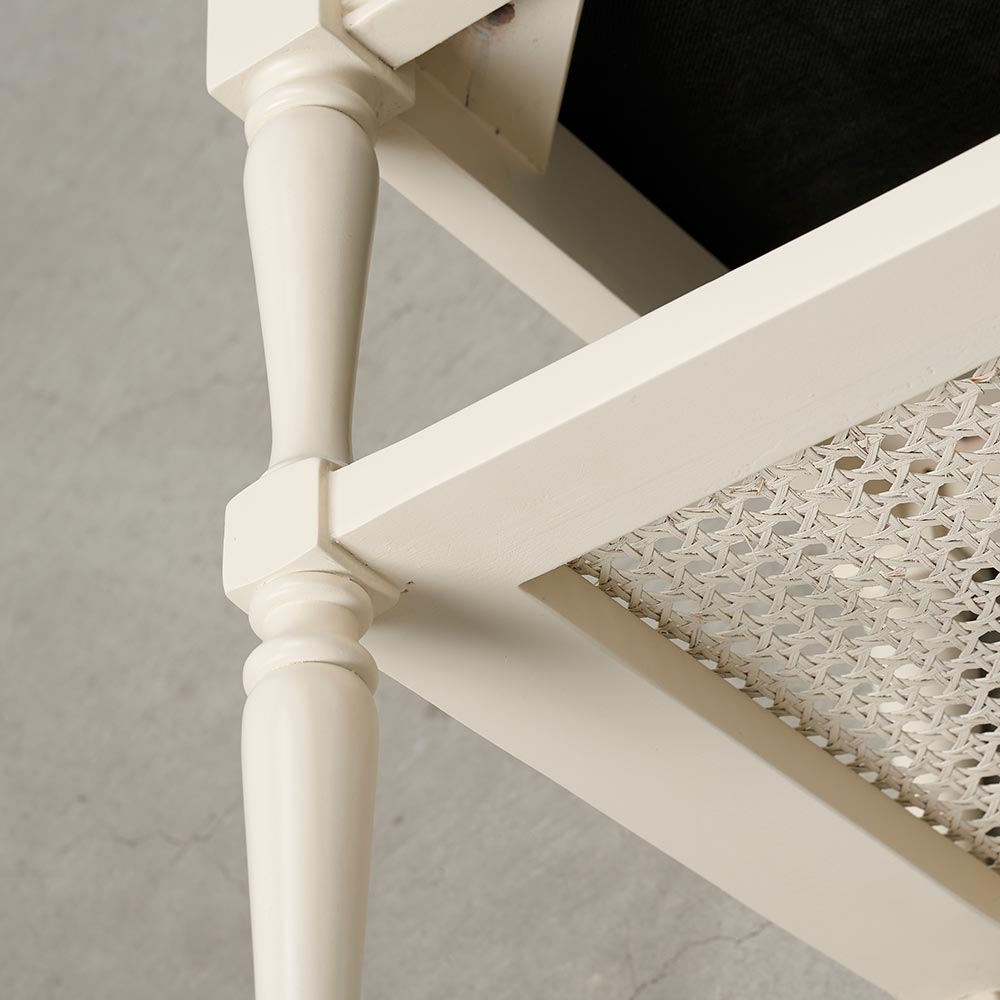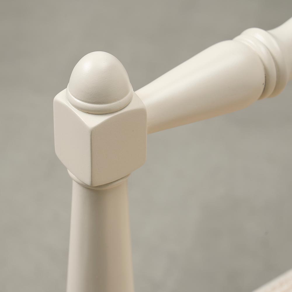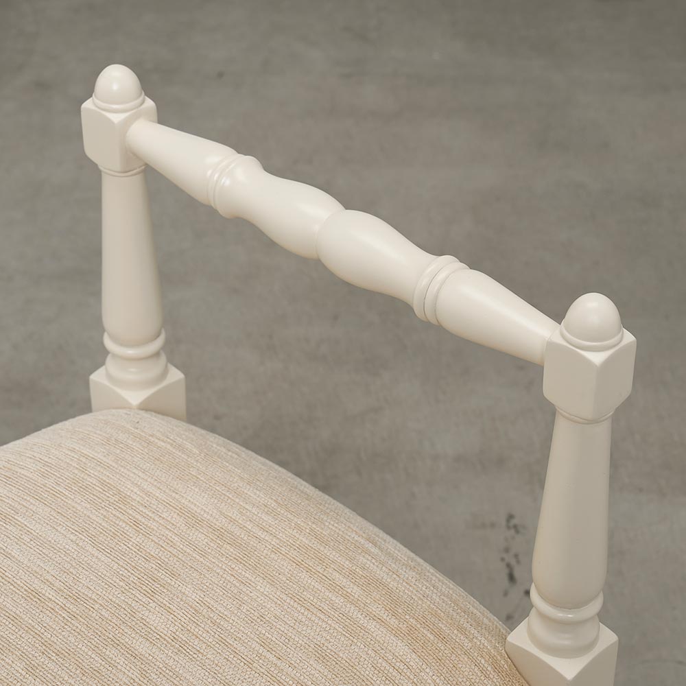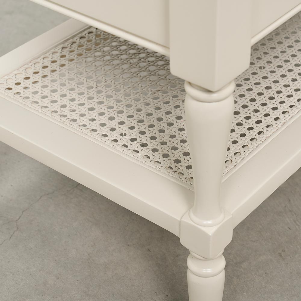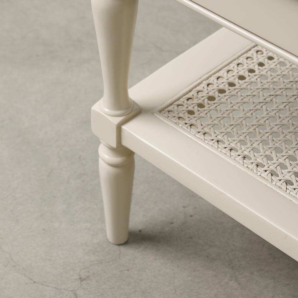 表面になめらかな木肌のリンデン材、脚部にマホガニー無垢材を使用。木肌が薄っすら見えるホワイトウォッシュ塗装で仕上げたフレンチシックエレガンスシリーズ。