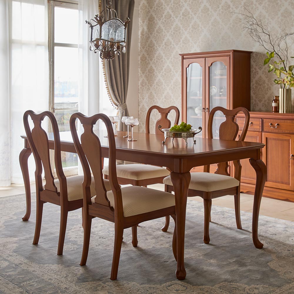 優雅な曲線を活かした猫脚のダイニングセットと、職人の手作業による木目の模様張りを施したボード類とのハーモニーが落ち着きのあるインテリアを創ります。