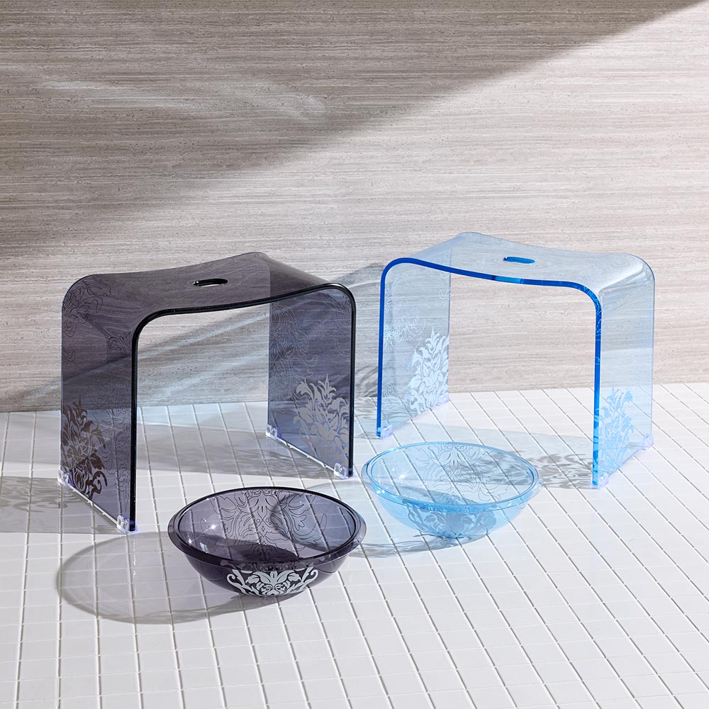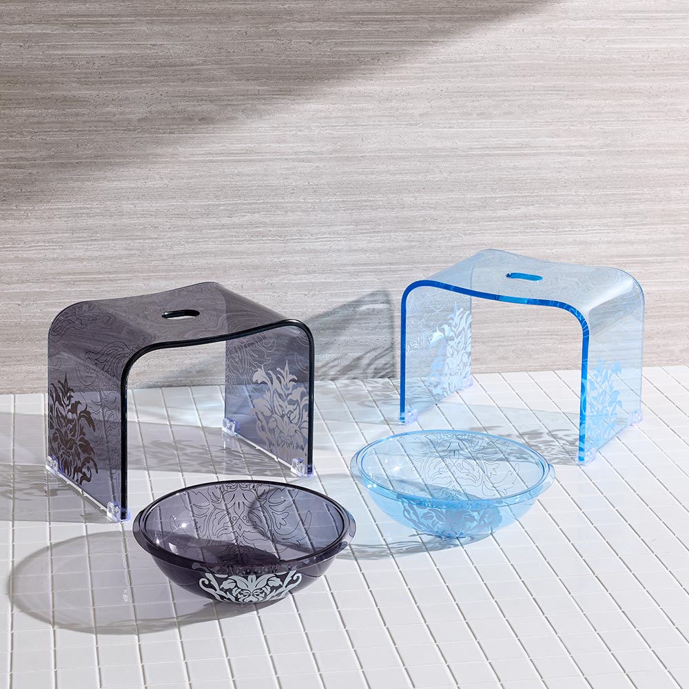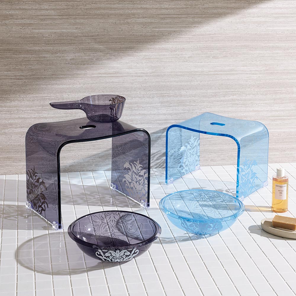 花のモチーフが散りばめられた北欧風のフラワーオーナメント柄。透き通るアクリルと相まってバスルームを上品に演出します。ブルー、ブラウン(ブラウングレー)、クリアカラーの3色からお選びいただけます。