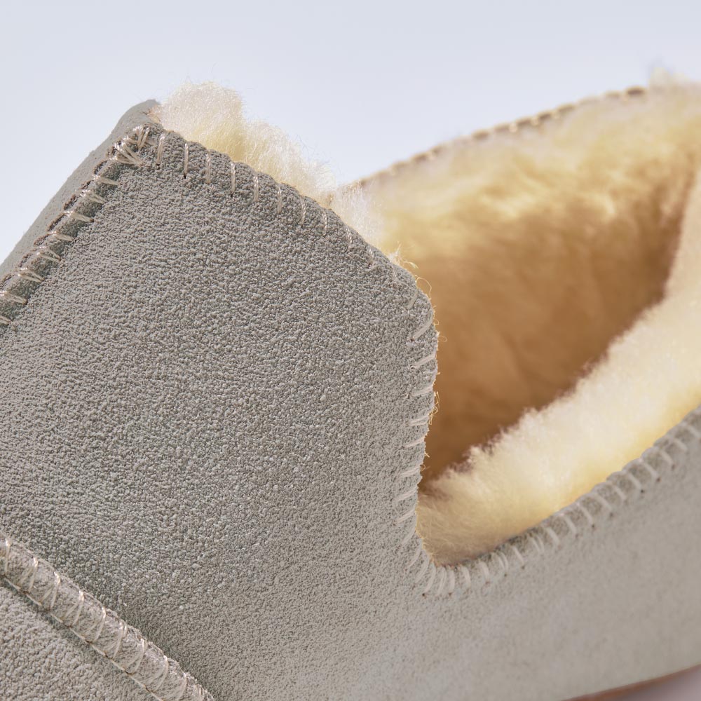 甲裏まで含めて、足が当たる部分にはすべてオーストラリア産の最高級ムートンを贅沢に使用しています。密度が高く弾力性のある羊毛は、長時間履いても疲れにくい履き心地を実現します。天然毛ならではの豊富な空気層が断熱材のように働き、寒い季節でも足元からしっかり温かさを持続。羊毛は吸湿・放湿バランスにも優れているため、蒸れにくく快適です。
