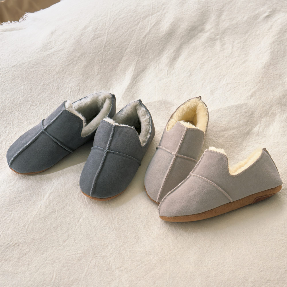 オーストラリア産の最高級ムートンを使用。足全体を包み込むデザインで履き心地◎。2色をご用意。 ※左から(イ)グレー (ア)ライトグレー