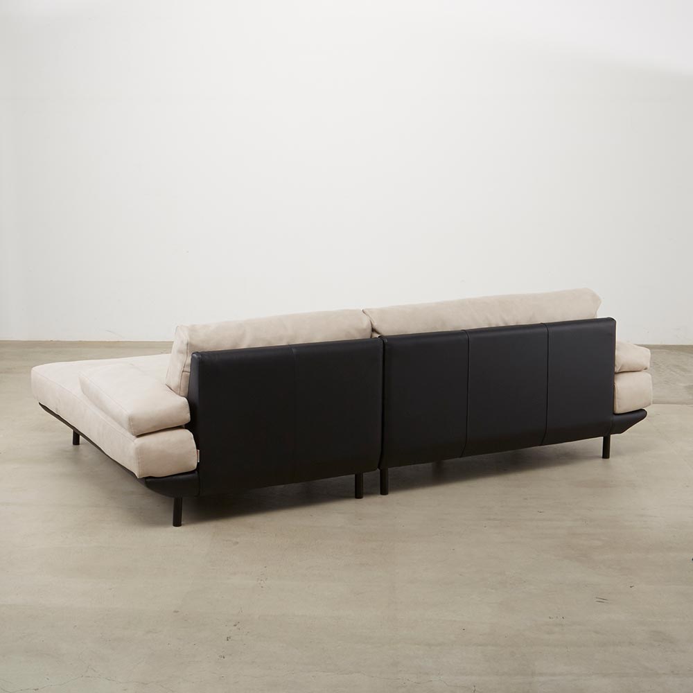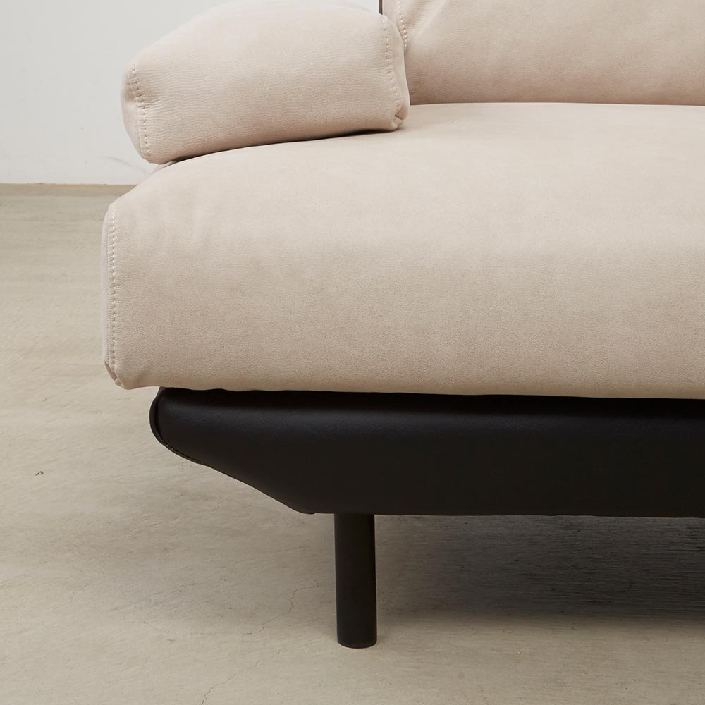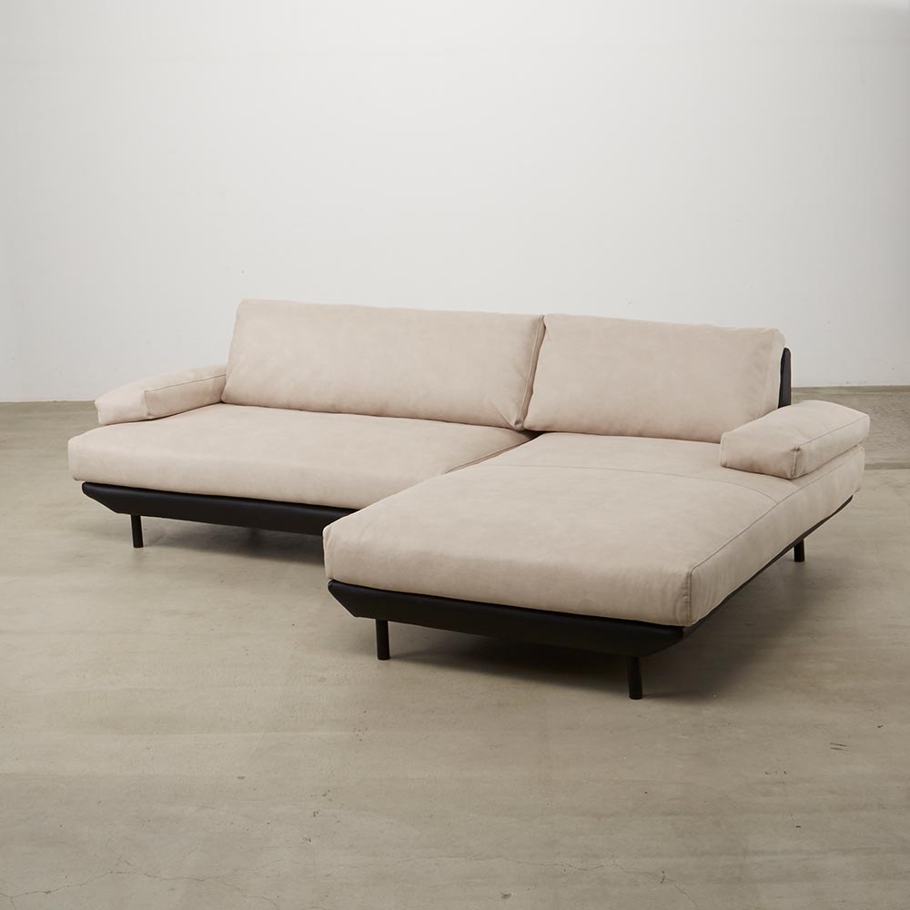 イタリア人デザイナーのモダンなデザインに異素材ツートン張りを採用し、クッション部分にはレザーテックス(ポリエステル布)を、フレームにはユーロテック(合成皮革)を使用。