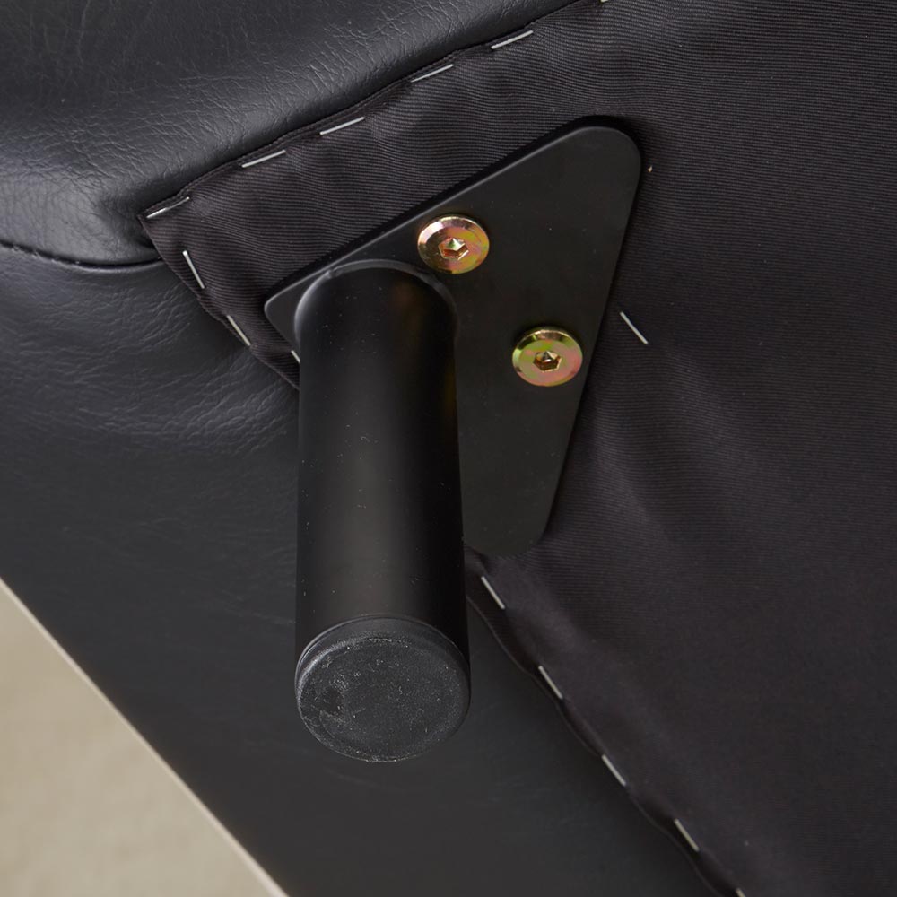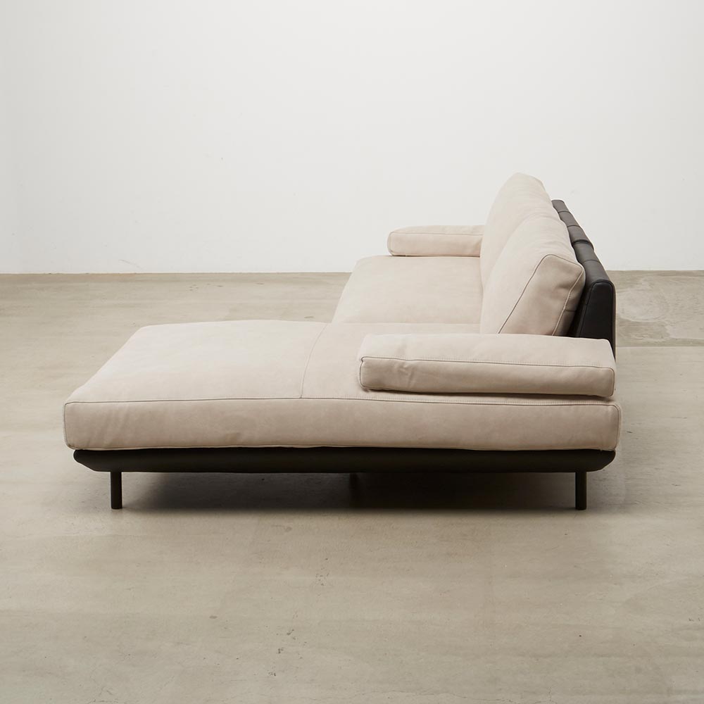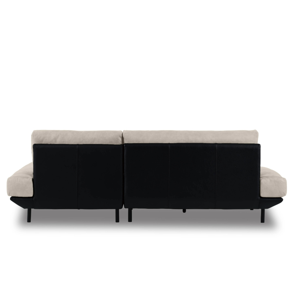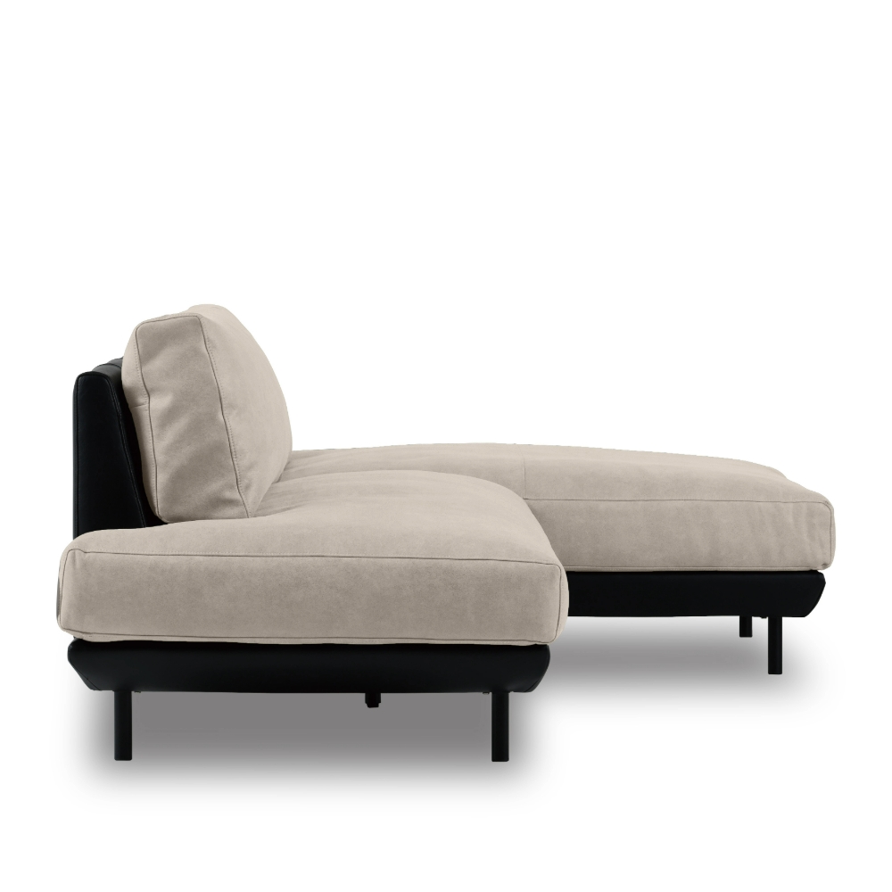 イタリア人デザイナーのモダンなデザインに異素材ツートン張りを採用し、クッション部分にはレザーテックス(ポリエステル布)を、フレームにはユーロテック(合成皮革)を使用。