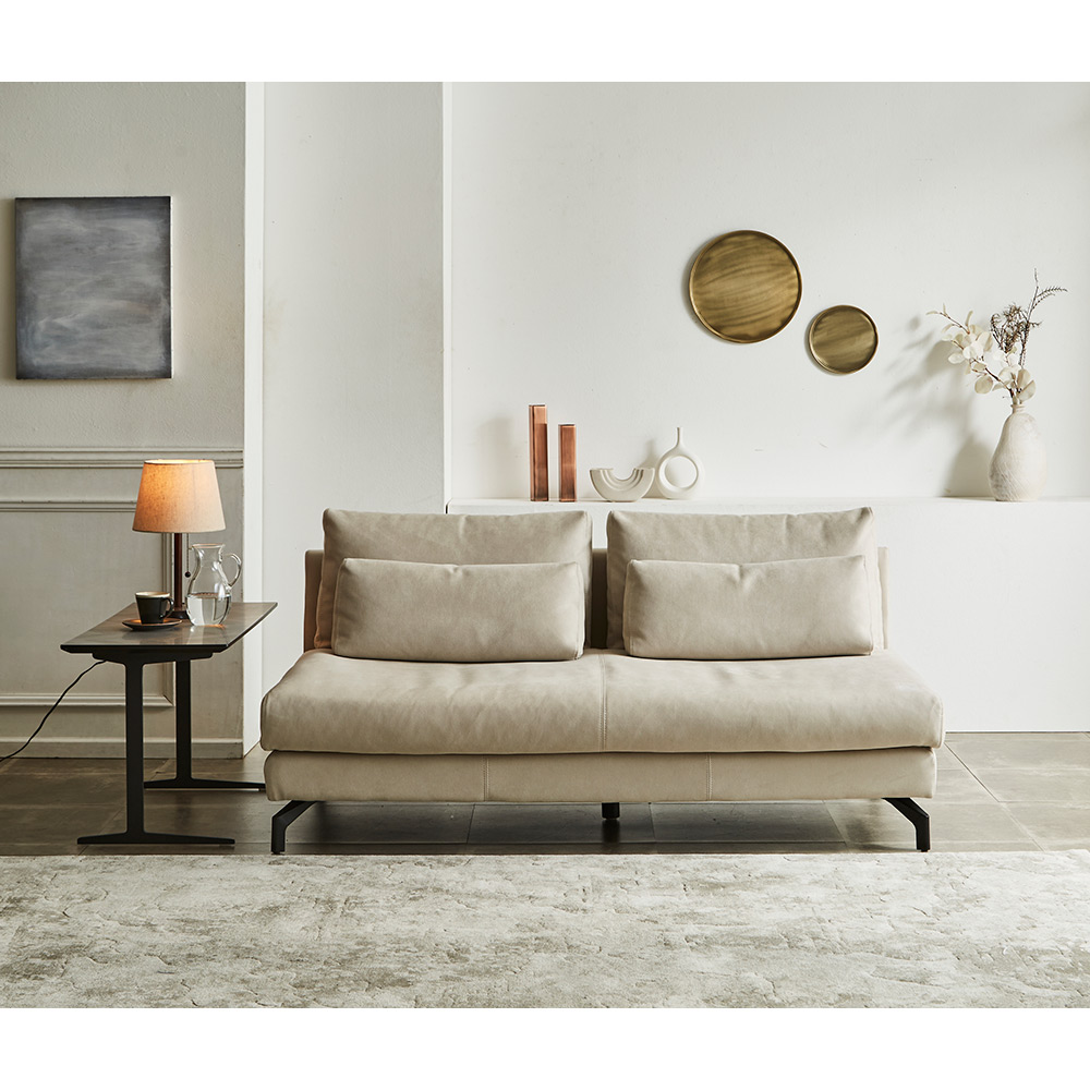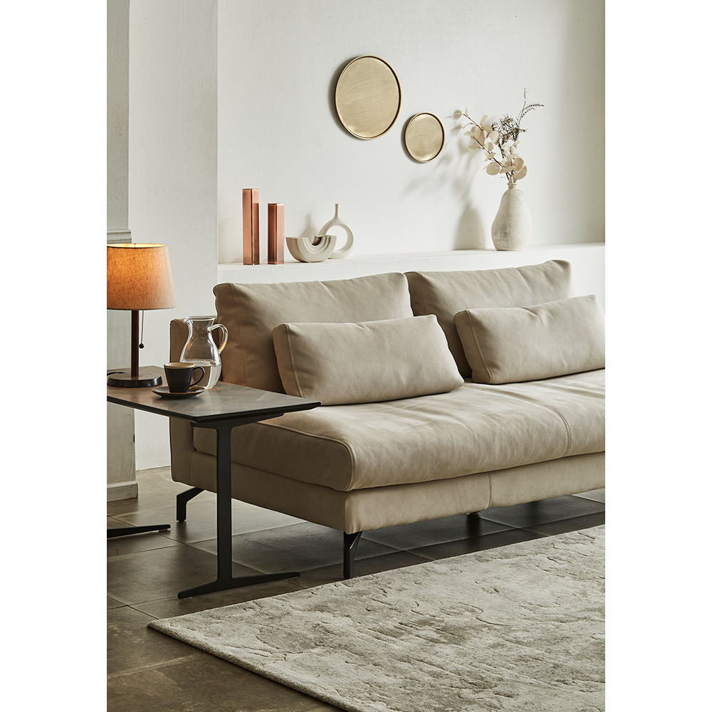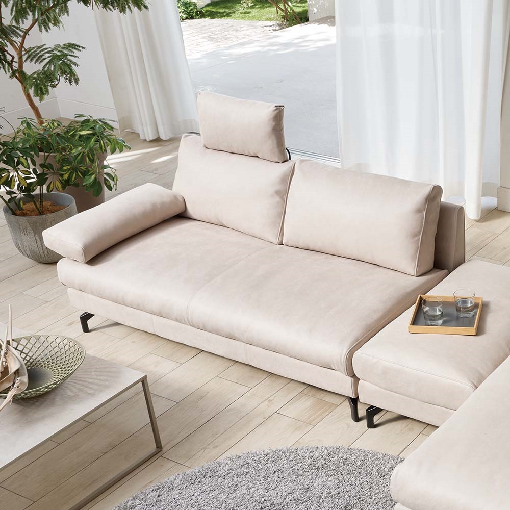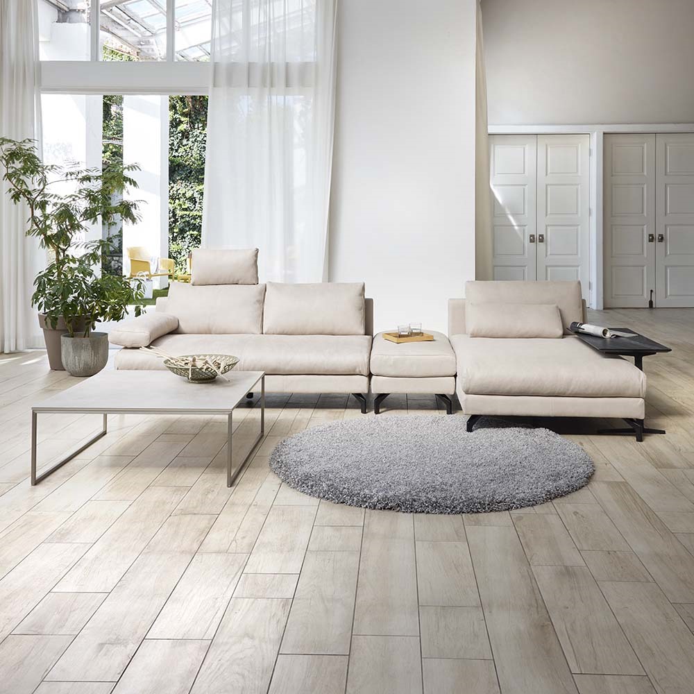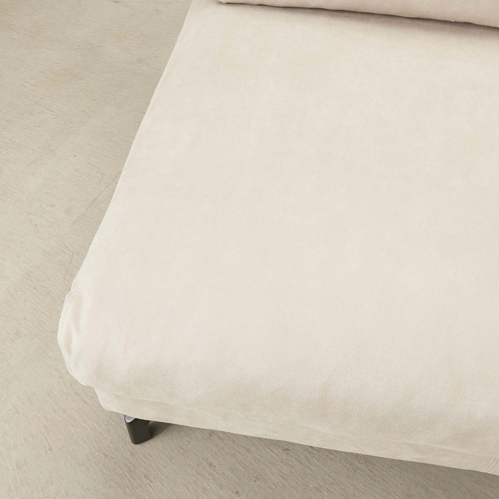 ラヴィアーノは、洗練されたスタイルと快適な座り心地を兼ね備えています。幅の広い奥行はヨーロッパの高級ソファでも中心になりつつあります。ラヴィアーノのサイズは大きくゆったりとした設計ですが、大小のクッションが取り外し自由なので、お好みに合わせて奥行を調整する事ができます。クッションを外した時の奥行は70cm以上あるので、セミシングルサイズのベッドに匹敵するほどの幅となります。他のサイズと組み合わせてデイベッドにしたり、ソファの上であぐらをかいたりと、ゆったりとくつろぐ事ができます。立ち上がりたくなくなる、ふんわりとした座り心地