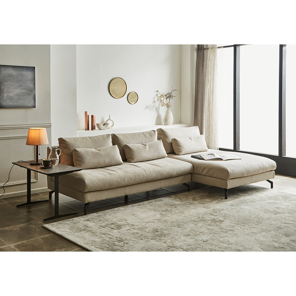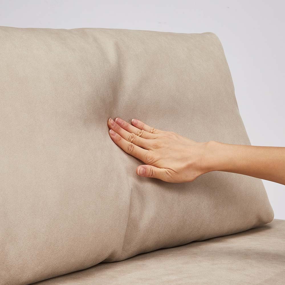 フェザーを贅沢に使用したクッションが、包み込むようなくつろぎを提供します。背もたれと座面にソフトフェザーが入っており、当たった瞬間はすごく柔らかい感触を与えてくれます。さらに座面には高密度ウレタンフォームを使用し、柔らかすぎない座面もこのソファのポイントです。お好みの組み合わせで、自由度の高いソファ
