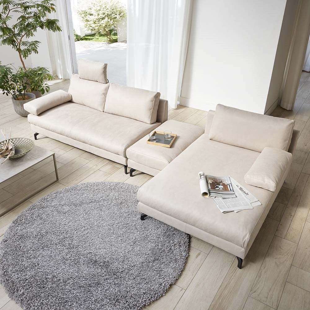 モジュール式の設計の為、自由な組み合わせが可能で、お部屋に調和するレイアウトが楽しめます。おすすめのレイアウトを一部ご紹介します。本革ソファのような質感を味わえるファブリックソファ