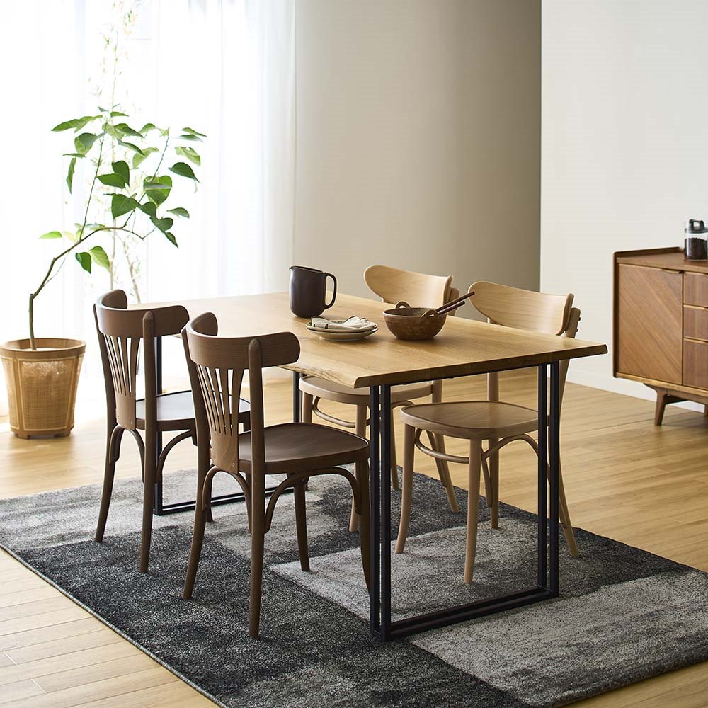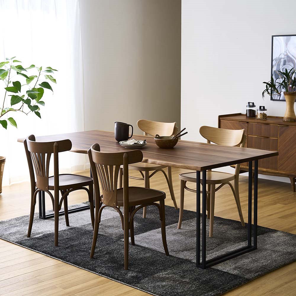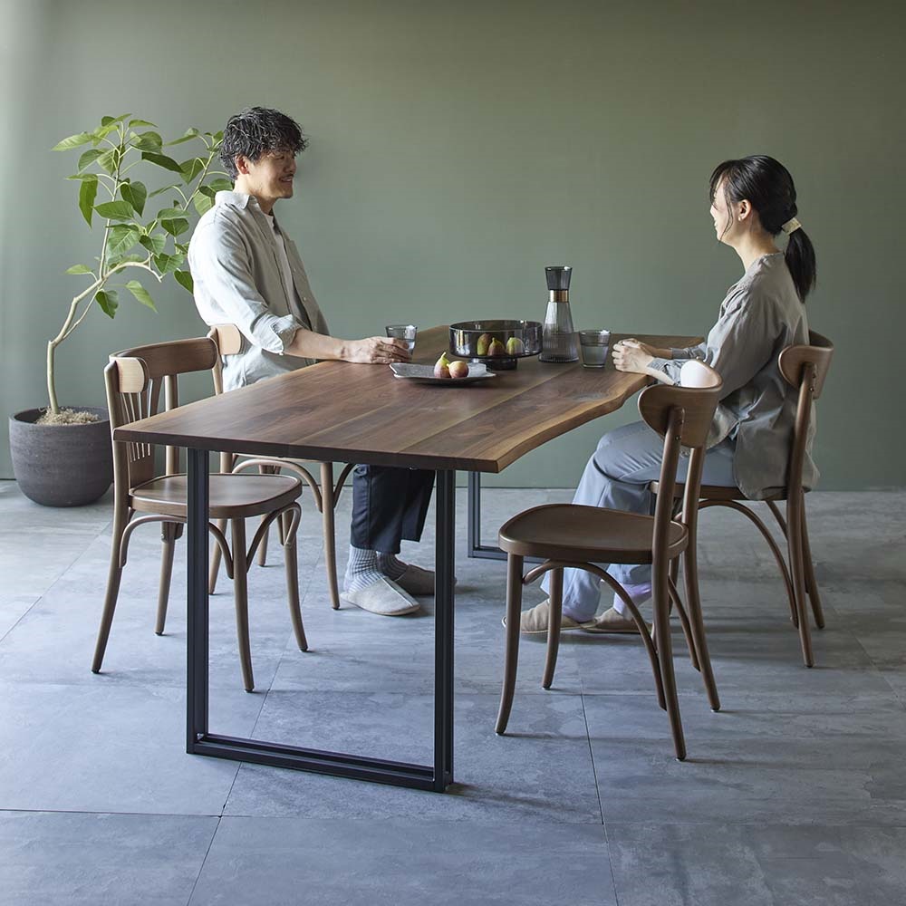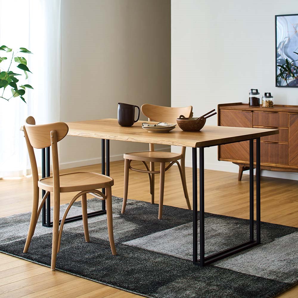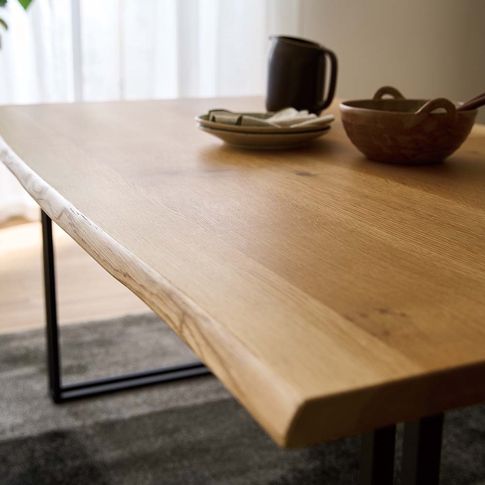 天然木の耳付き材を贅沢に使用した、一枚板風ダイニングテーブルです。「耳」とは丸太の一番外周部にあたる材料のこと。本物の一枚板となると高価になりがちですが、耳付き材と無垢材とを組み合わせて作ることで、一枚板のような迫力をより手の届きやすい価格で実現しました。