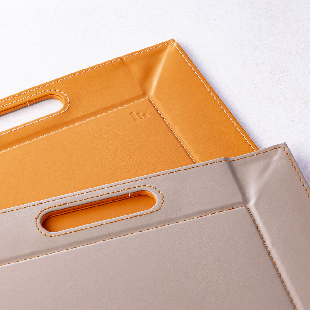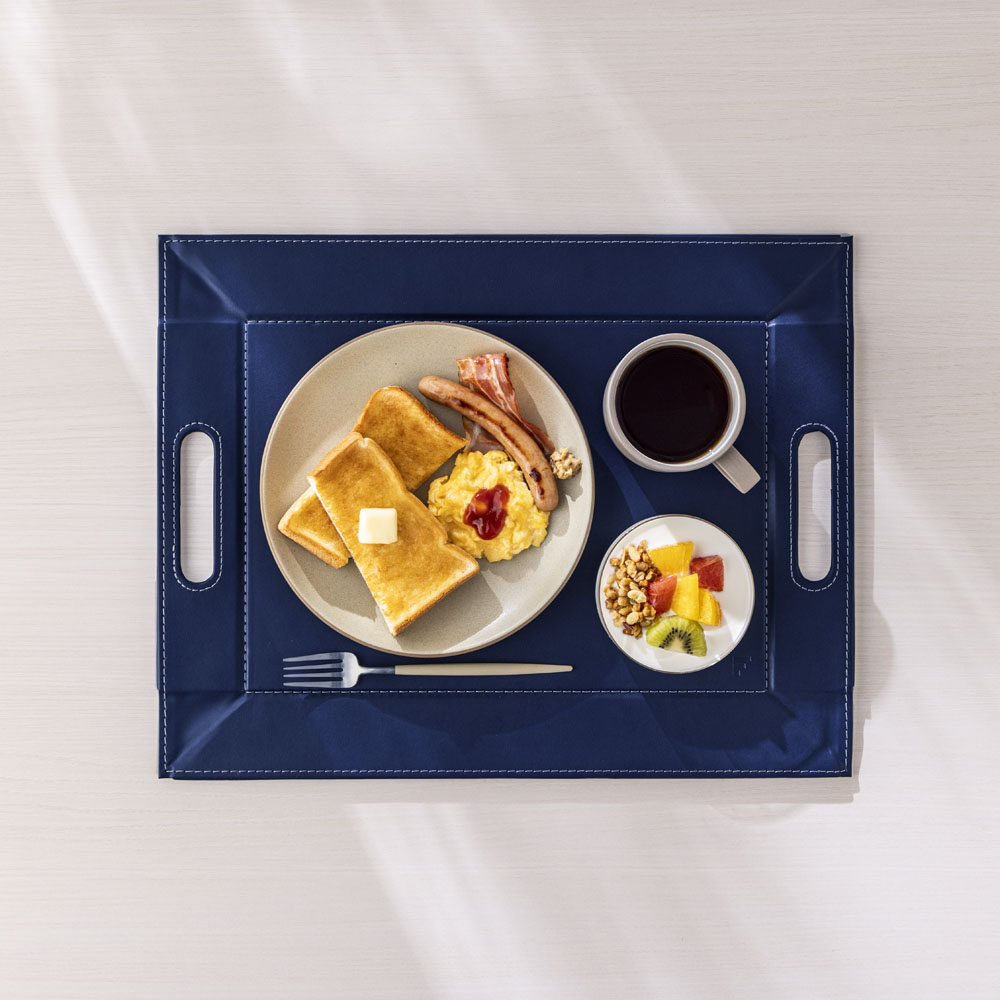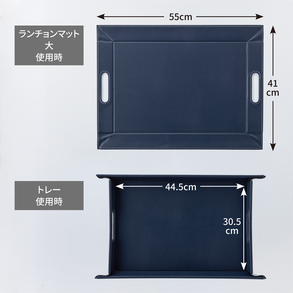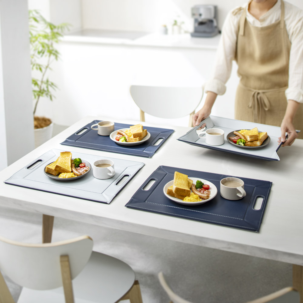 薄い芯材入りのしっかりしたつくりで、持ち上げるとトレー、卓上に置くとランチョンマットに早変わり。表面は滑りにくい仕様なので、食器やカトラリーをのせても安定感がありスムーズに運べます。 ※画像は小サイズ(イ)ネイビー×ライトグレー。